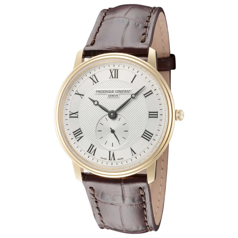 FC-235M4S5 פרדריק קונסטנט שעון יוקרה לגבר יבואן רשמי | סלימליין דגם דק במיוחד ברצועת עור חומה | לוח לבן מיוחד רומיות | שעון שניון קטן בלוח | שנתיים אחריות Frederique Constant Slimline Quartz FC-235M4S