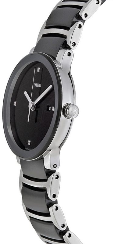 R-09353071 ראדו יד 2 שנייה שעון לנשים | ראדו מסדרת סנטריקס הקלאסית | דגם לאישה ברצועת קרמיקה ולוח שחור 4 יהלומים | חנות שעוני RADO בראשון לציון | RADO Centrix R30935712 Two-Tone Black/Silver WOM