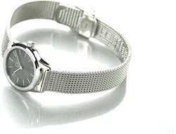 K3M23124 שעון יד קלווין קליין לנשים דגם כסוף בלוח אפור פסים | רצועת רשת אופנתית | מנגנון שווצרי | שנתיים אחריות | מלאי מוגבל | Calvin Klein Minimal Quartz Grey Dial Ladies Watch K3M23124