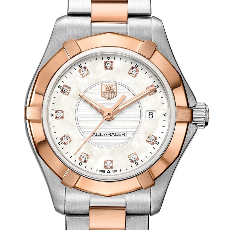 WAP1451.BD0837 שעון יוקרה של טאג הויאר לנשים | דגם רוז גולד 18K משולב ברצועה | לוח פנינה משובץ 11 יהלומים | מלאי מוגבל כולל שנתיים אחריות | WAP1451.BD0837 - TAG Heuer Aquaracer Quartz 18K DIAMOND Watc