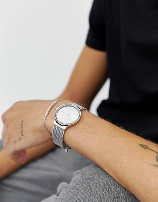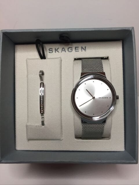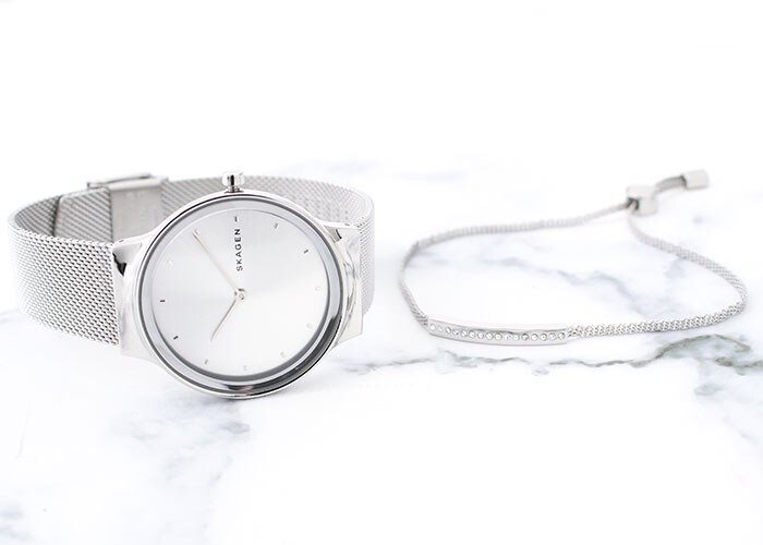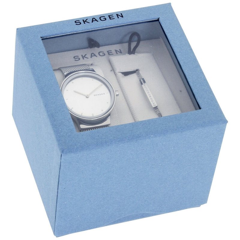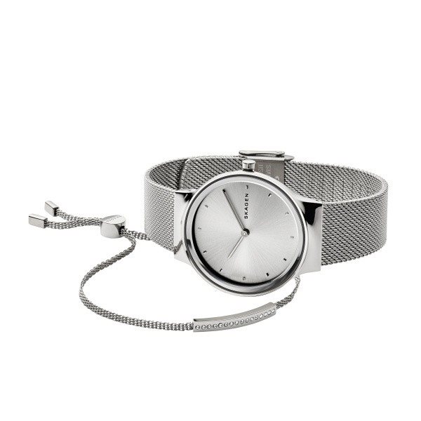 SKW1105 שעון יד כסוף סט מתנה כולל צמיד של סגאגן | דגם לנשים כולל שנתיים אחריות | מלאי מוגבל | שעוני אופנה במבצע | Skagen SKW1105 Freja mesh watch & bracelet gift set
