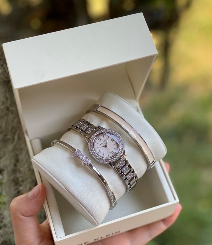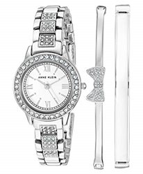 AK-3334LPST סט שעון ו 2 צמידים משובצים אבני סברובסקי | שעון אופנתי כסוף של אן קליין | מלאי מוגבל | Anne Klein Pink Dial Quartz Ladies Watch and Bracelet Set