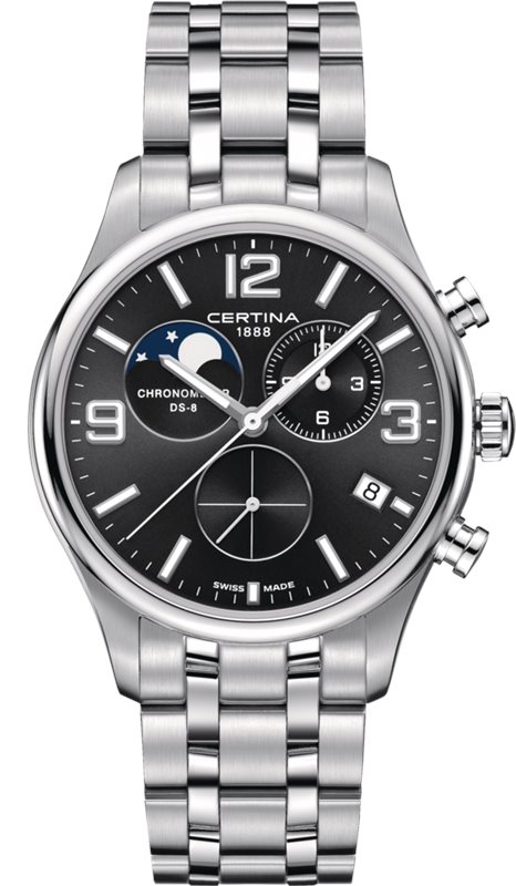 C033.460.11.057.00 שעון יד סרטינה מהמם לגברים בלוח שחור מיוחד עם תצוגת ירח | דגם כרונוגרף כולל 5 שנים אחריות יבואן רישמי | חנות שעוני סרטינה בראשון לציון | Certina C033.460.11.057.00 DS 8 model series