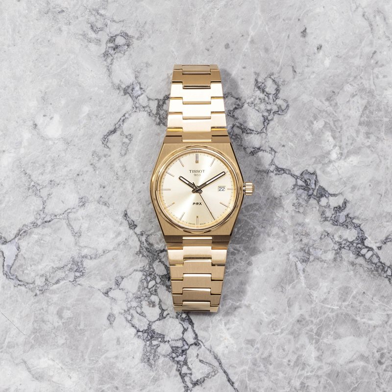 T137.210.33.021.00 שעון טיסו זהב לנשים דגם מיוחד מהסדרה החדשה של PRX | שעון יוקרתי עמיד למים | אחריות יבואן רישמי | TISSOT PRX Gold Stainless Steel Bracelet T1372103302100