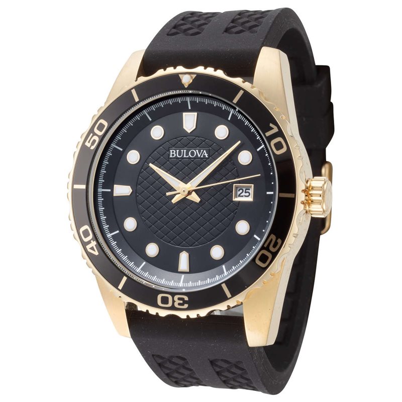 98B261 שעון בולובה ספורטיבי אלגנטי רוז גולד בלוח שחור זוהר בחשכה | דגם לגברים כולל שנתיים אחריות | Bulova Men's Black Silicone Strap Watch 43mm 98B261