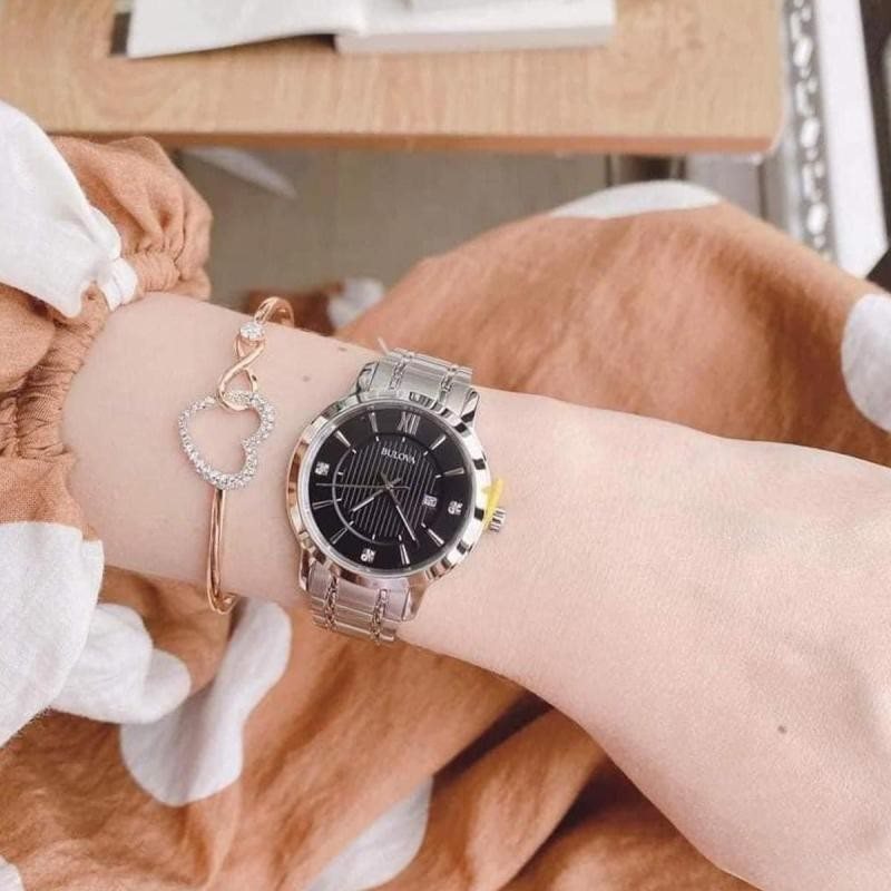 96P185 שעון בולובה משובץ 3 יהלומים בלוח שחור פסים כולל תאריכון | רצועת פלדת אל חלד שנתיים אחריות | Bulova Women's Diamond Accent Stainless Steel Watch - 96P185
