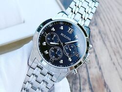 96D136 שעון בולובה לגברים דגם כרונוגרף בלוח שחור משובץ 8 יהלומים | שנתיים אחריות | Bulova Men's Diamond Accent Chronograph Watch 96D136