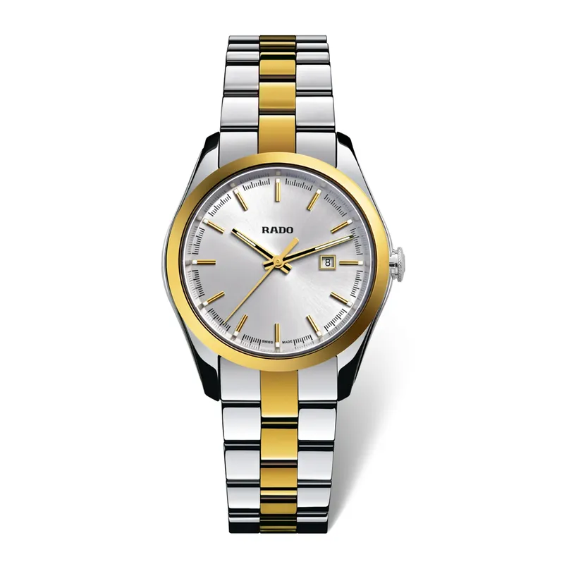 R32975112 שעון ראדו לנשים מסדרת הייפרכרום | רצועה משולבת זהב קרמי | לוח פסים כסוף כולל תאריכון | שנתיים אחריות | מלאי מוגבל |Rado HyperChrome Steel and Ceramic Women's Watch R32975112