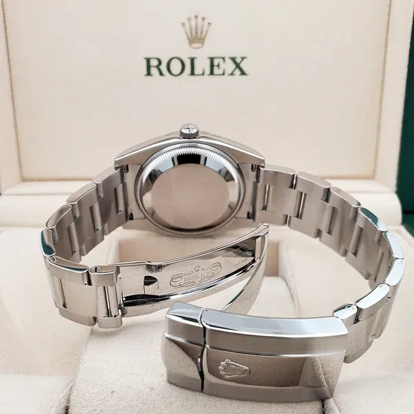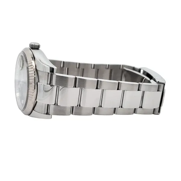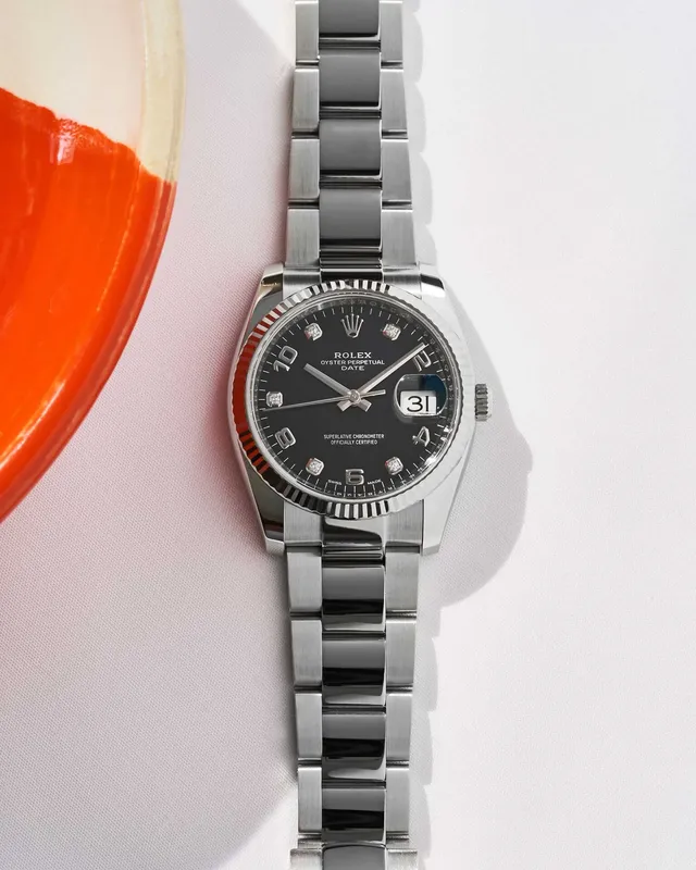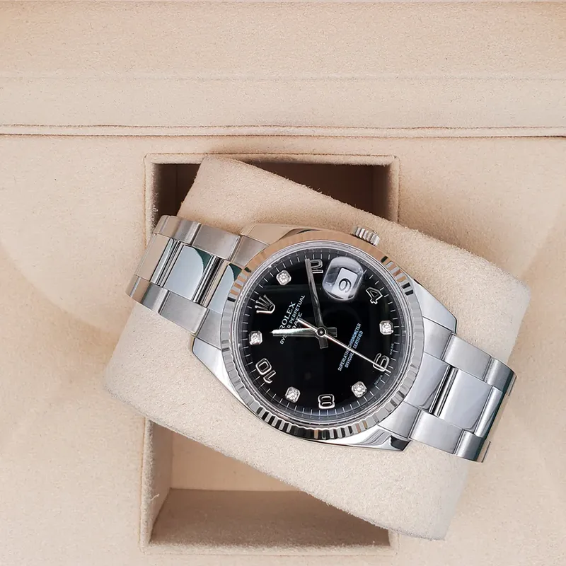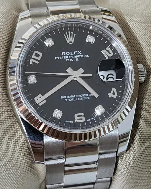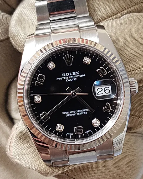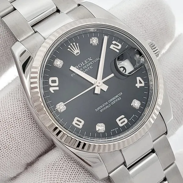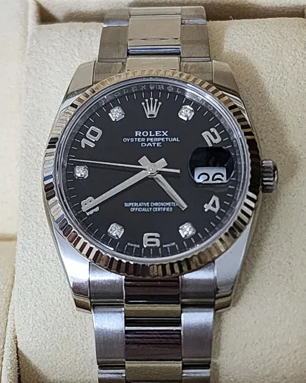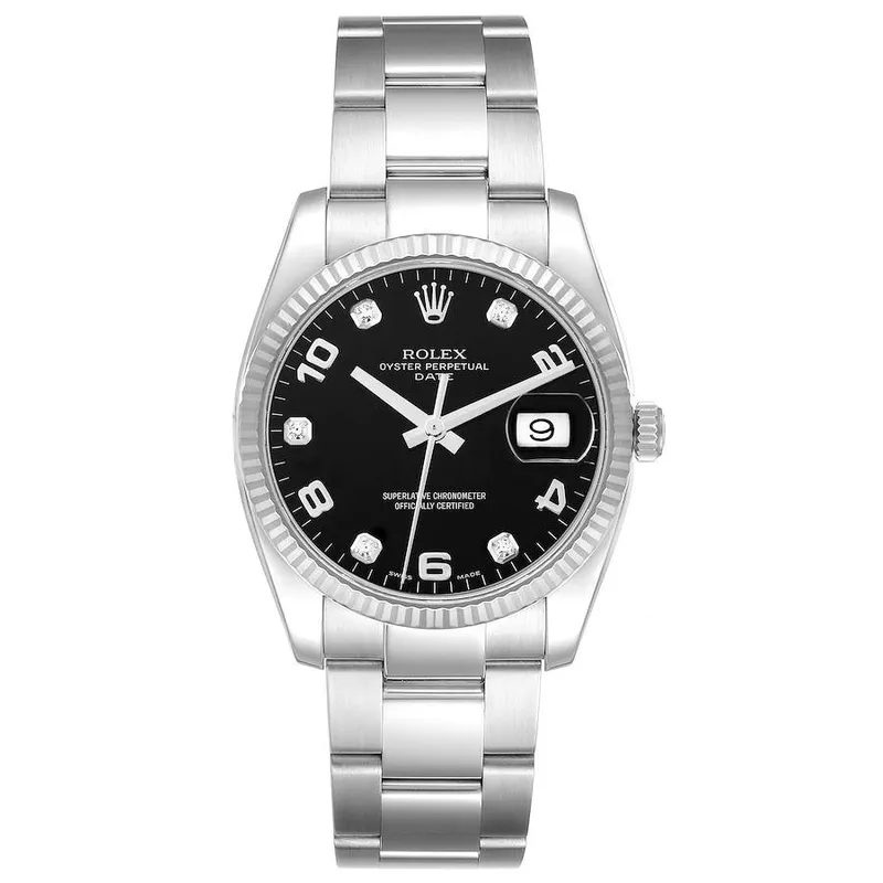 115234 שעון רולקס יד שנייה מסדרת דייט 34 מ''מ לוח שחור משובץ יהלומים | שעון כמו חדש כולל תעודות ושנה אחריות | Rolex Date 34 Steel White Gold Black Diamond Dial Watch 115234