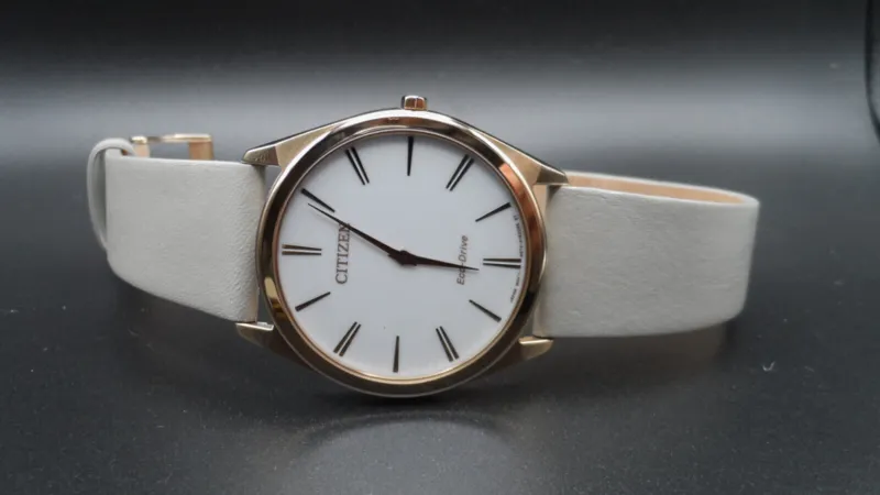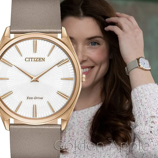 AR3076-08A שעון מיוחד לנשים של סיטיזן יפן מנגנון אקו דרייב | דגם רוז גולד בלוח לבן | שעון גדול ודק במיוחד | רצועתצ עור אפורה | Citizen Women's Stiletto 39mm Eco-Drive Solar Quartz Watch AR3076-08A