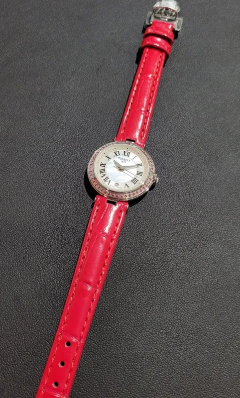 T126.010.66.113.00 שעון מושלם לאישה של טיסו בליסימה | דגם משובץ 47 יהלומים אדומים ברצטעת עור | לוח רומי פנינה | שנתיים אחריות מלאי מוגבל | Tissot T- My Lady Bellissima Ladies Watch White T126010661130