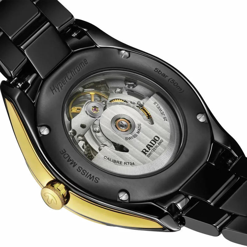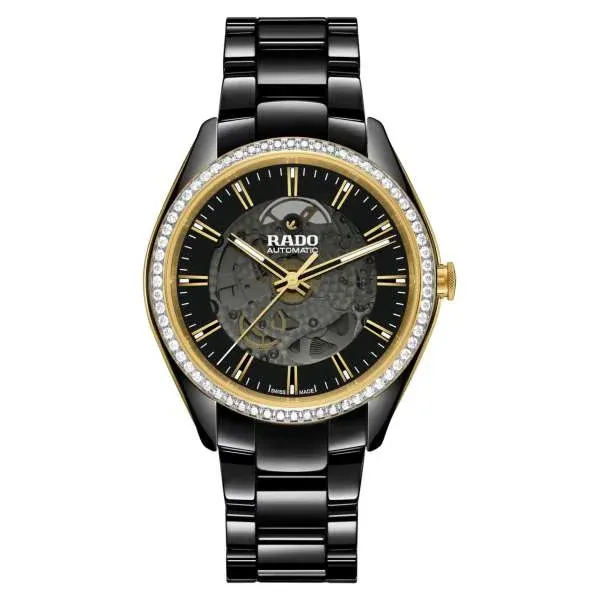 R-61573015 שעון ראדו יבואן רשמי למסדרת הייפרכרום | דגם אוטומטי סקלטון יוניסקס | משובץ 64 יהלומים בבאזל | 5 שנים אחריות | Rado HyperChrome Automatic Diamonds 42mm Black-Gold Men's Watch R32157152