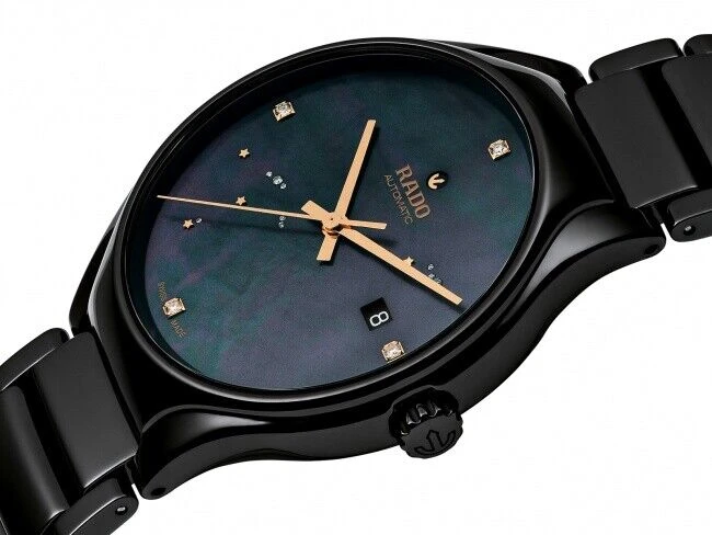 R27056842 שעון מיוחד של ראדו לגברים קרמיקה מסדרת טרו סטאר | דגם בלוח פנינה משובץ 14 יהלומים | מנגנון אטומטי 80 שעות | מלאי מוגבל | שנתיים אחריות | Rado Automatic Diamonds Black Mother Of Pearl R270568