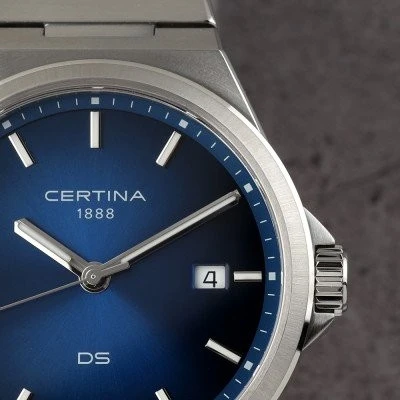 C043.410.11.041.00 שעון יד סרטינה מהדגם החדש של די אס 7 | לוח כחול מרשים בצמיד אינטגרלי | 5 שנים אחריות יבואן רשמי | Certina DS-7 Quartz (39mm) Blue Dial Stainless Steel C0434101104100