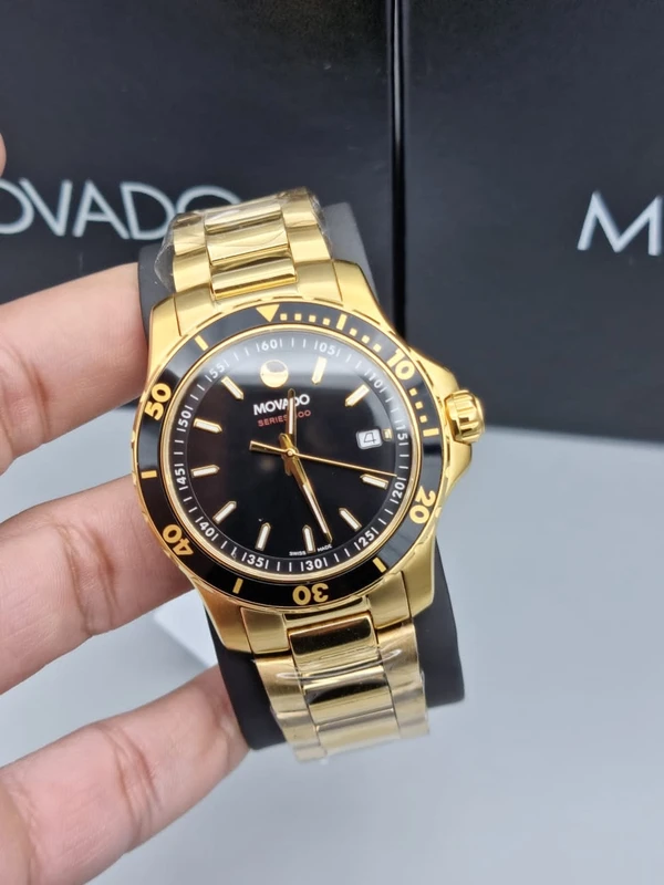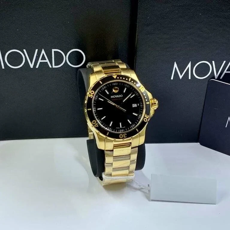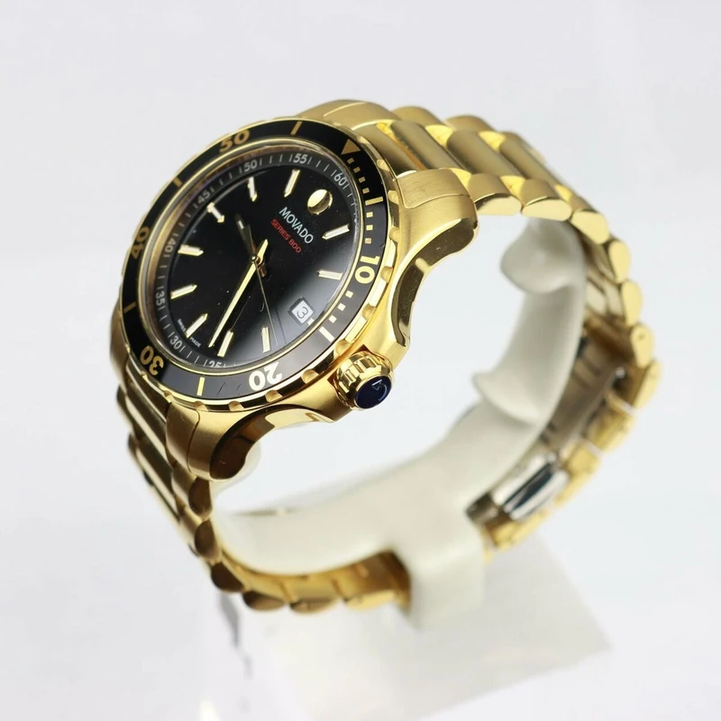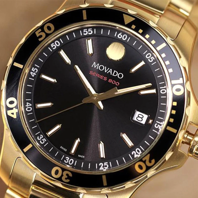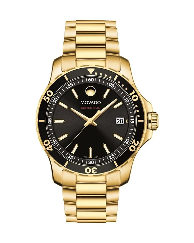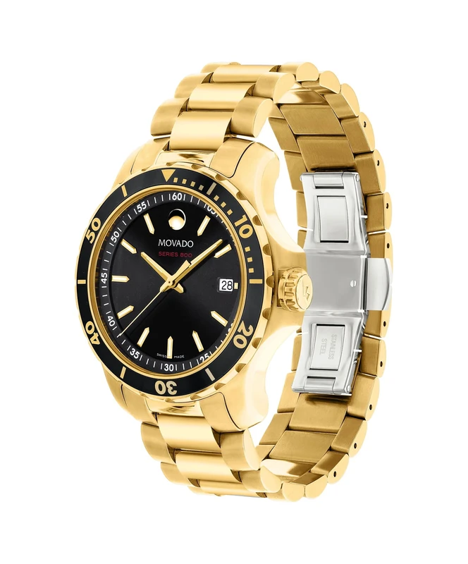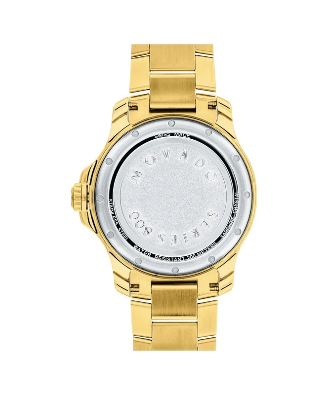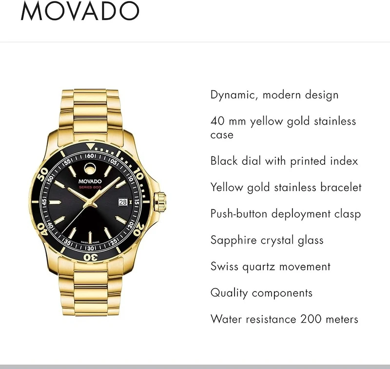 2600145 שעון ספורטיבי אלגנטי של מובאדו לגברים מסדרת 800 | שעון זהב בלוח שחור 200 מטר | שעון יוקרתי שווצרי כולל אחריות יבואן רשמי | Movado Series 800 Black Dial Yellow Gold Tone Men's Watch 2600145