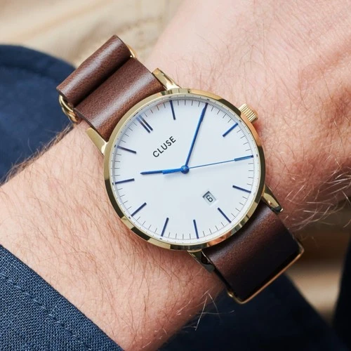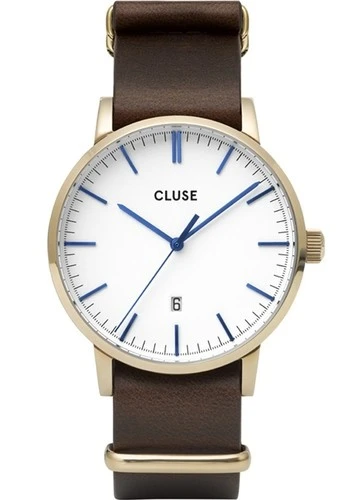 CW0101501007 שעון אלגנטי לגברים ברצועת עור חומה | באזל זהב בלוח בהיר אינדקס כחול | שנתיים אחריות יבואן רשמי | CLUSE Aravis Gold Brown Leather Strap CW0101501007