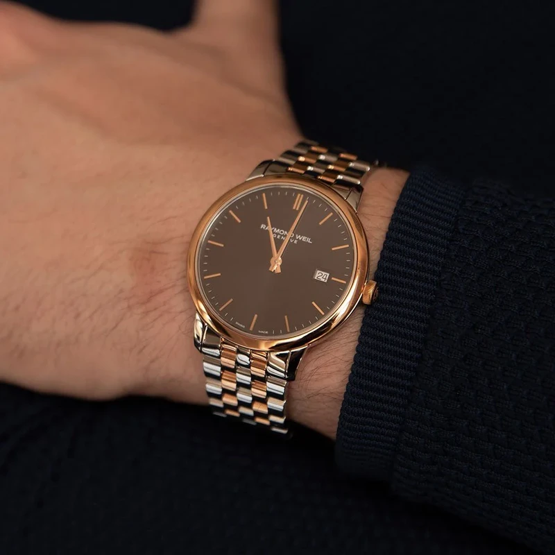 5485-SP5-20001 שעון יוקרתי לגברים של ריימונד ווייל דגם טוקטה רוז גולד משולב | לוח שחור כולל תאריכון | Raymond Weil Toccata Quartz Watch | 5485-SP5-20001