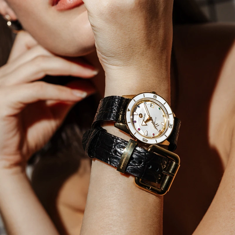 צבע לוח השעון : לבן - משובץ 8 יהלומים צבעוניים