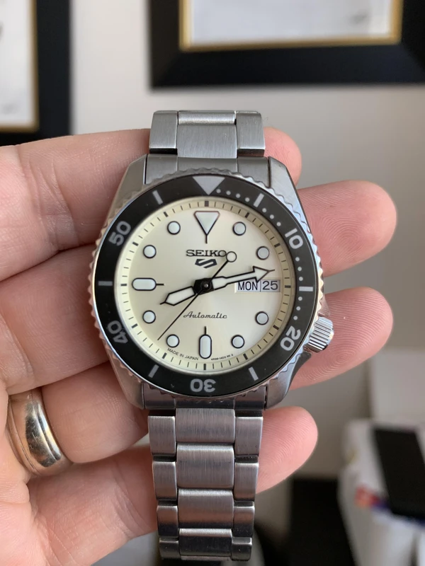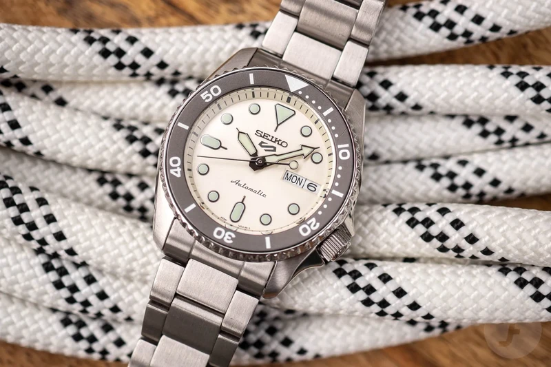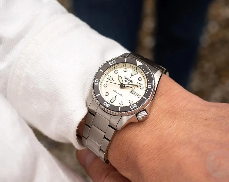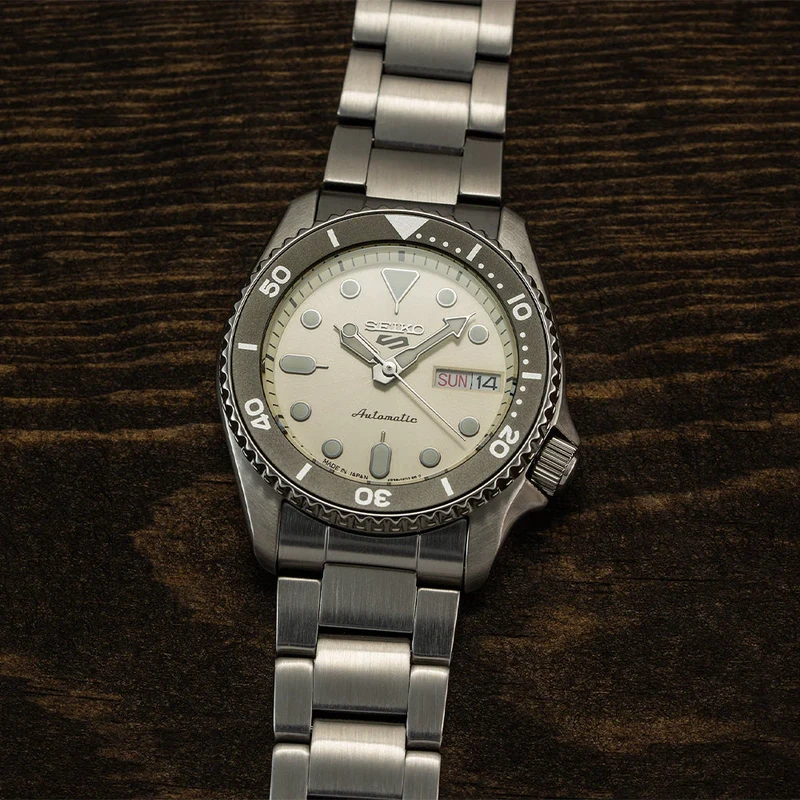 שעון 5 Seiko Sports יוניסקס מסדרת ה SKX Sports Style האהובה. לוח השעון בצבע בז'-שמנת