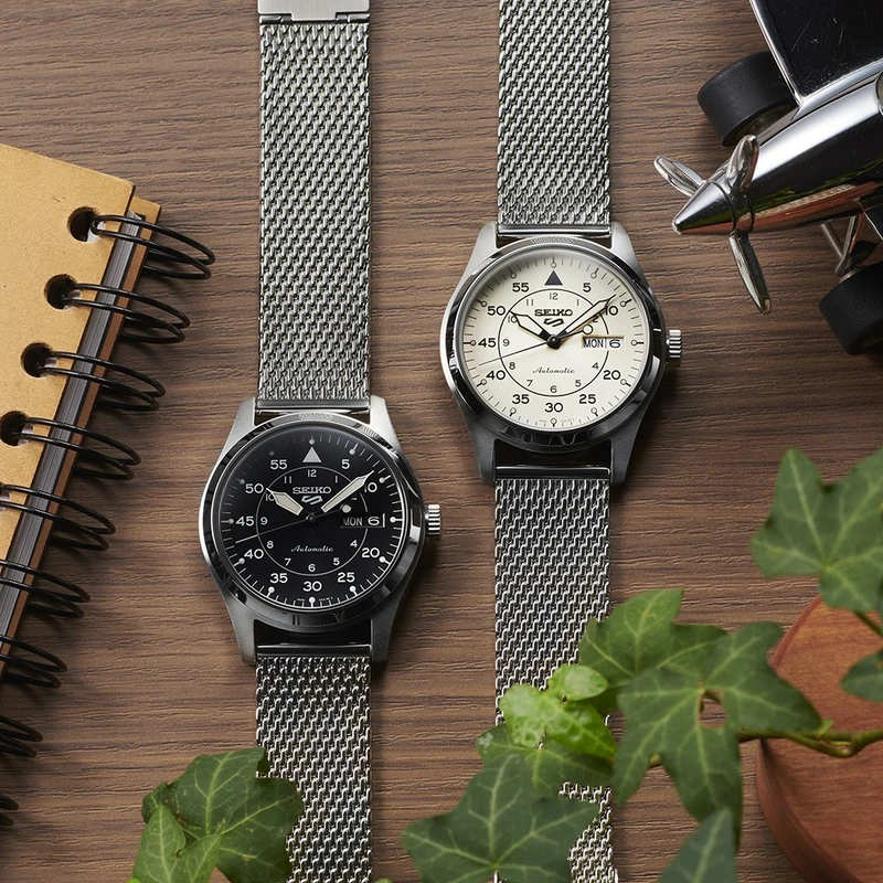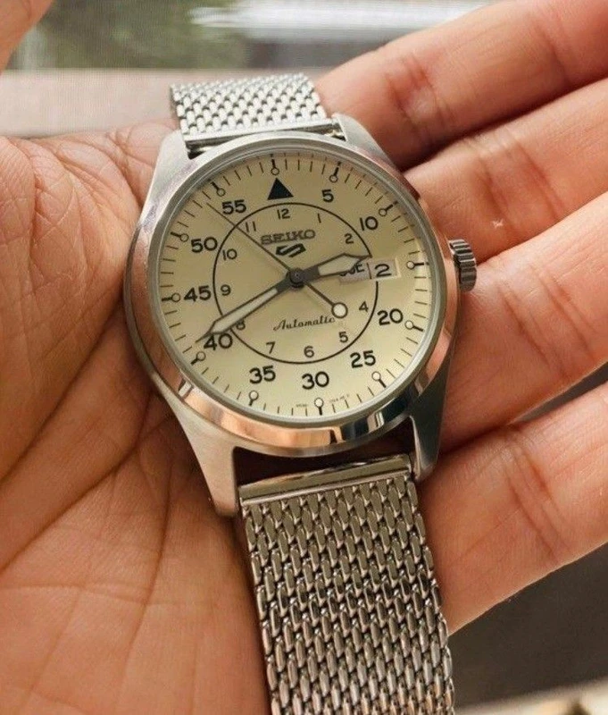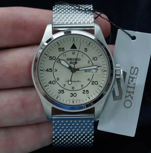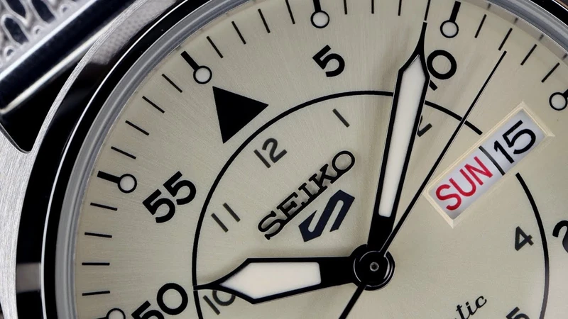 שעון SEIKO 5 SPORT עם לוח בצבע קרם הכולל תאריכון וחלון המציג את היום בשבוע, וסימוני ספרות ומחוגים לבנים המחופים בלומיברייט הזוהר בחושך.
