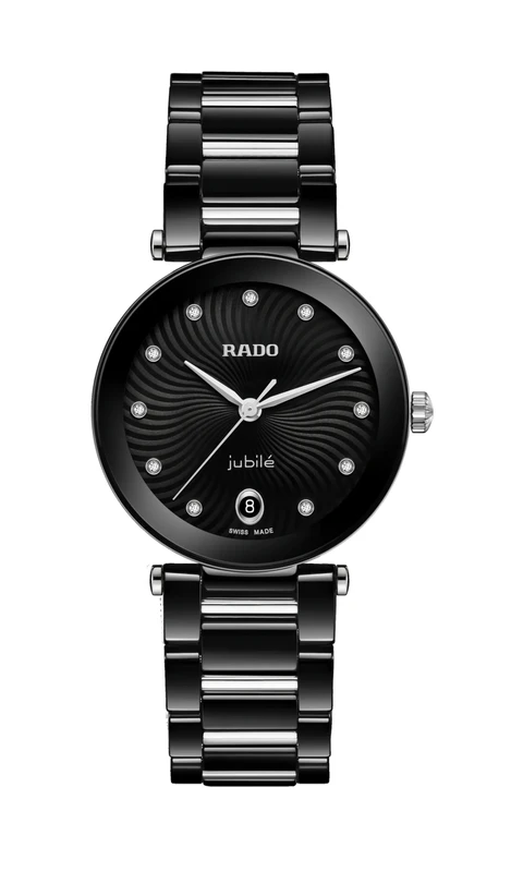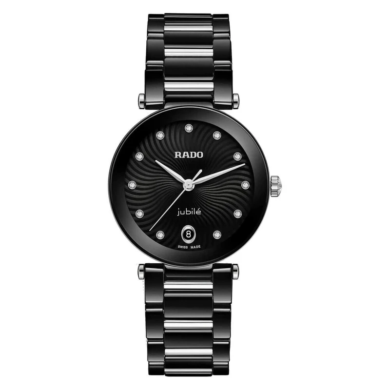 R-62433070 | R22243703 ראדו יבואן רשמי מסדרת לה קופל החדשה | דגם קרמי בלוח שחור גלים מהפנט משובץ 11 יהלומים | רצועה שחורה עם כסף מלאי מוגבל בישראל | Rado LaCoupole Diamonds 31mm Ladies Watch R22243703