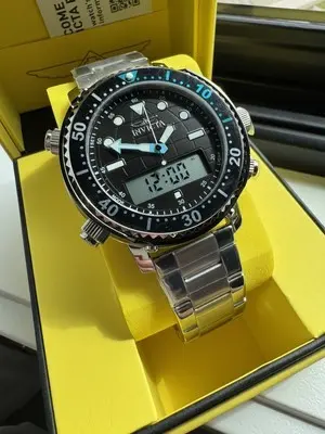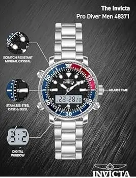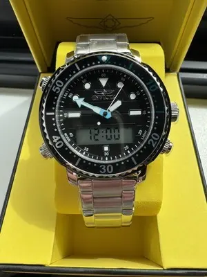 48370 שעון אינוויקטה אנלוגי דיגיטלי לגברים | דגם ברצועת פלדת אל חלד | לוח שחור זרחני באזל טורקיז | כולל תאורה שעון מעורר ועוד |Pro Diver Alarm Chronograph Quartz Analog-Digital Black Dial Men's Watch