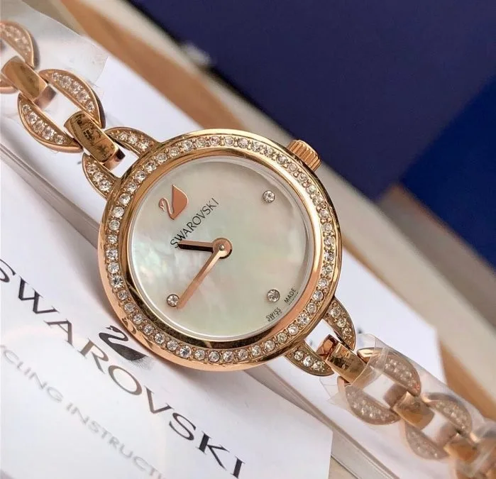 5253329 שעון יד סברובסקי לאישה | דגם צמיד מיוחד אופנתי רוז גולד | אבנים ברצועה ובבאזל | מנגנון שווצרי | שנצתיים אחריות יבואן רשמי | Aila Quartz Crystal White Mother of Pearl Dial Ladies Watch 5253329