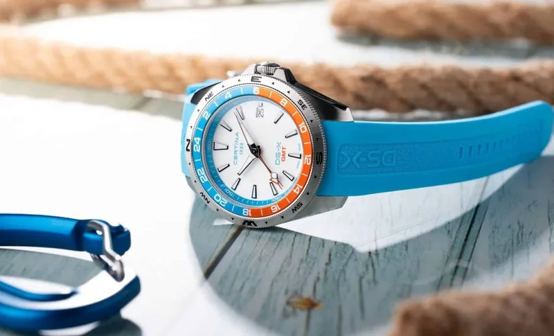 C047.452.17.011.00 שעון סרטינה די אס אקס GMT החדש לגברים | דגם ספורטיבי בלוח לבן עם רצועת ספורט מיוחדת | מנגנון שווצרי Certina DS-X GMT 41mm White Dial Turqoise Blue Rubber Strap C0474521701100