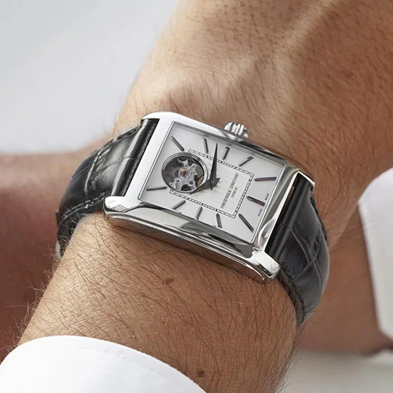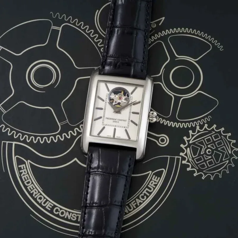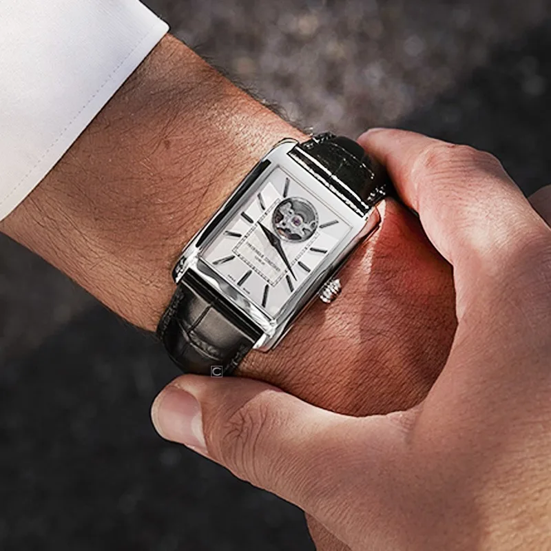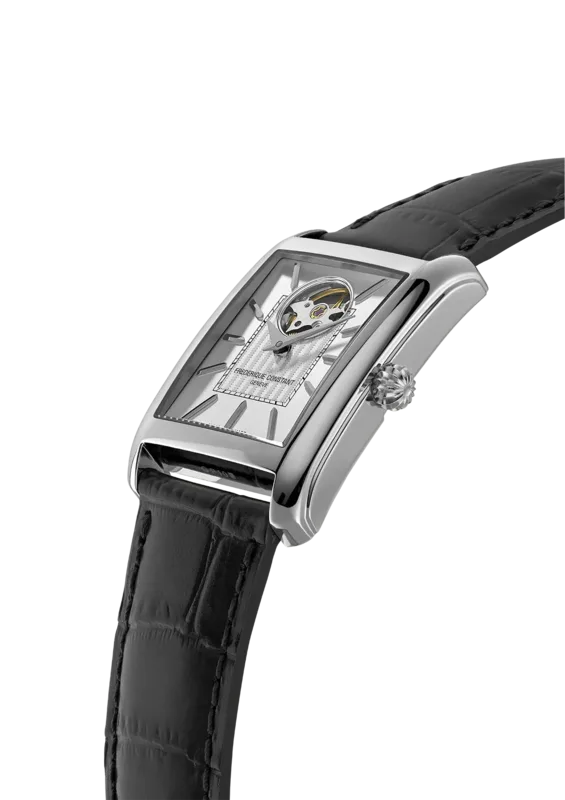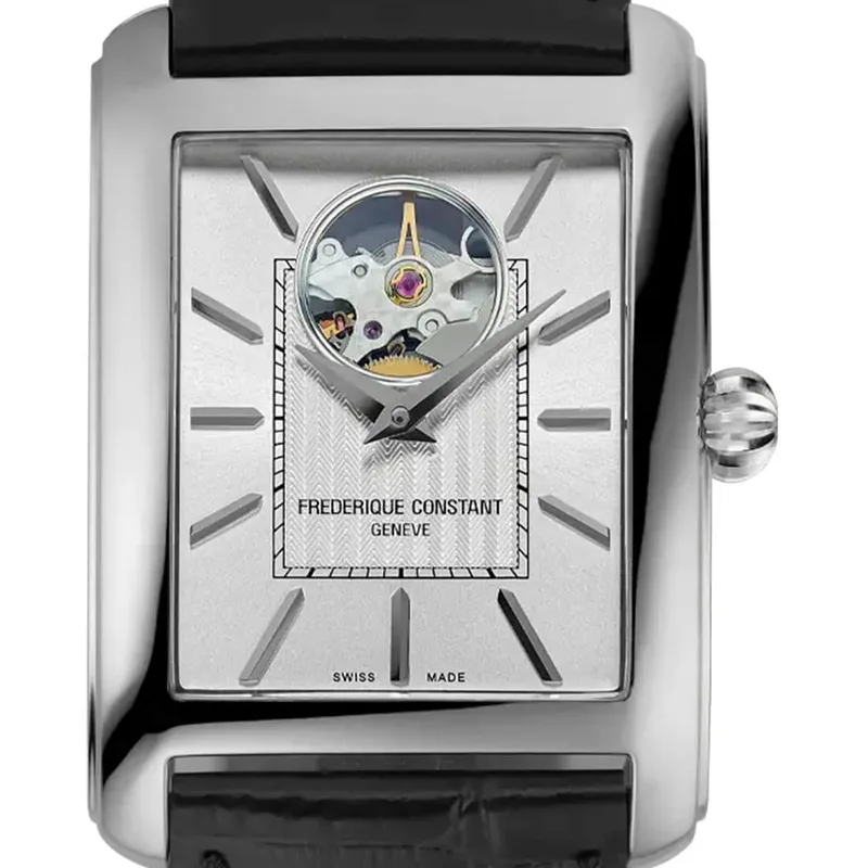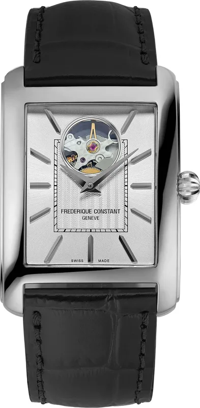 FC-311S4C6 שעון אלגנטי יוקרתי מלבני של פרדריק קונסטנט לגברים | לוח כסוף סאנריי עם לב פתוח | מנגנון אוטומטי גב שקוף | שנתיים אחריות יבואן רשמי | Carrée Heart Beat Automatic FC-311S4C6