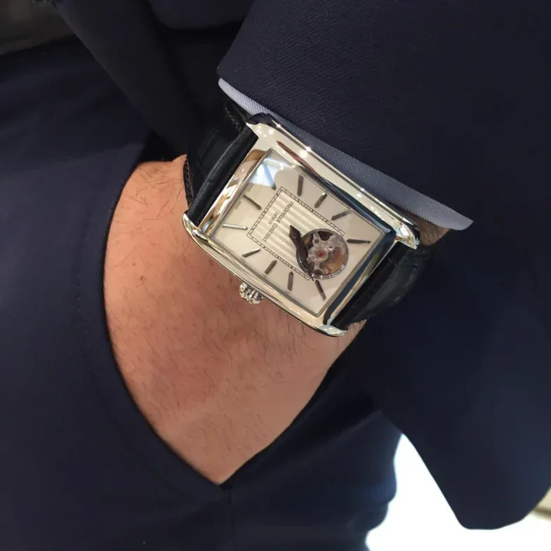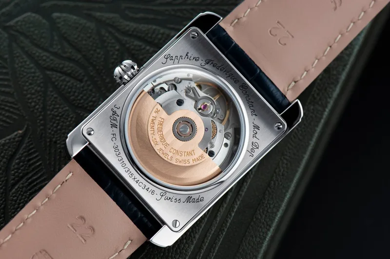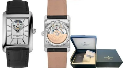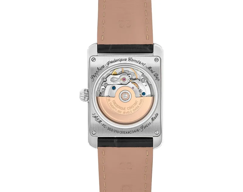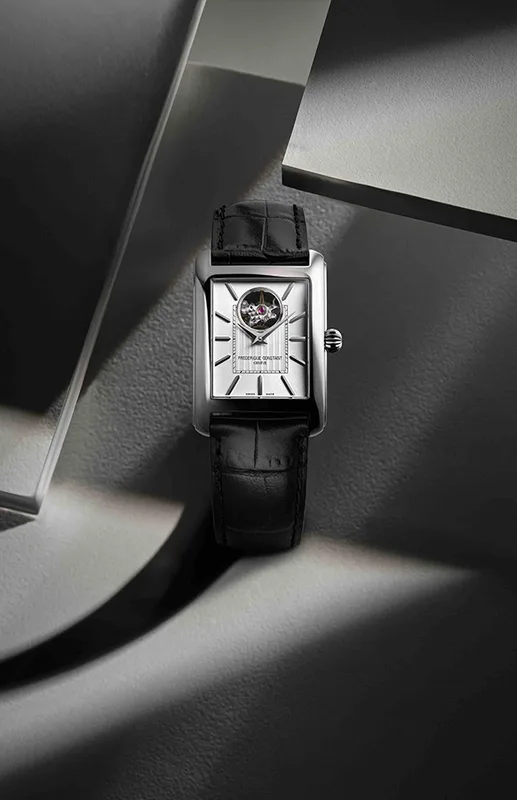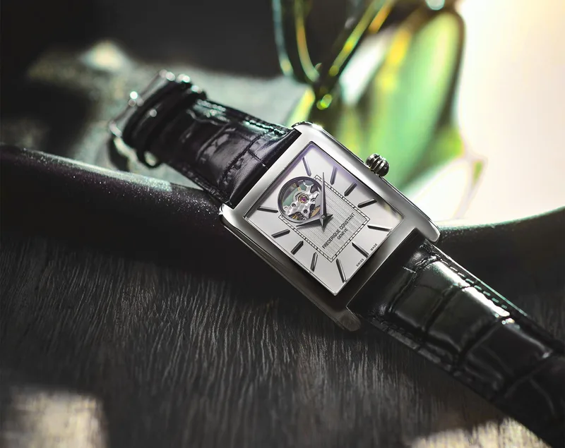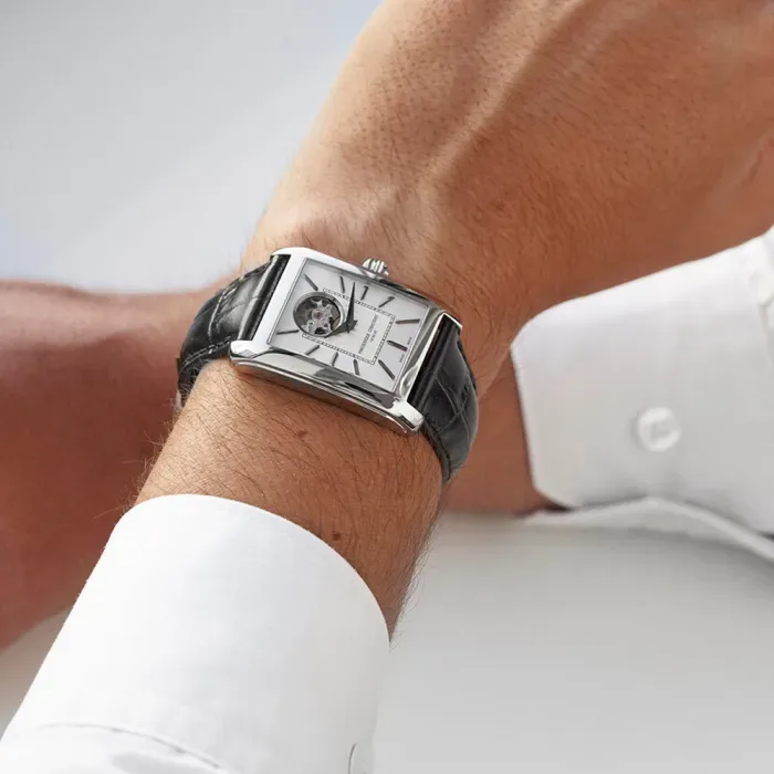 FC-311S4C6 שעון אלגנטי יוקרתי מלבני של פרדריק קונסטנט לגברים | לוח כסוף סאנריי עם לב פתוח | מנגנון אוטומטי גב שקוף | שנתיים אחריות יבואן רשמי | Carrée Heart Beat Automatic FC-311S4C6