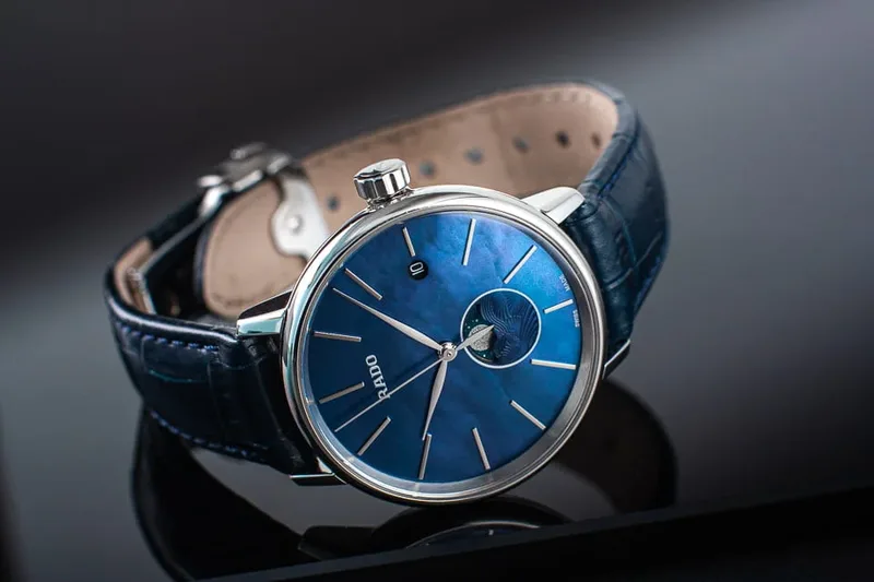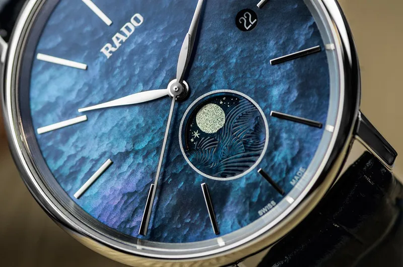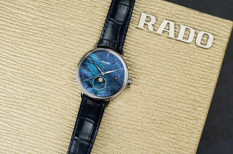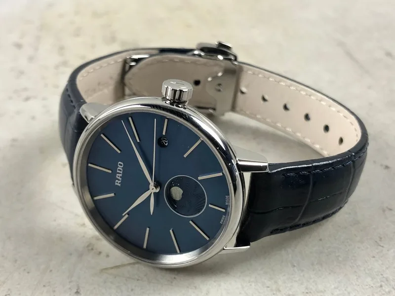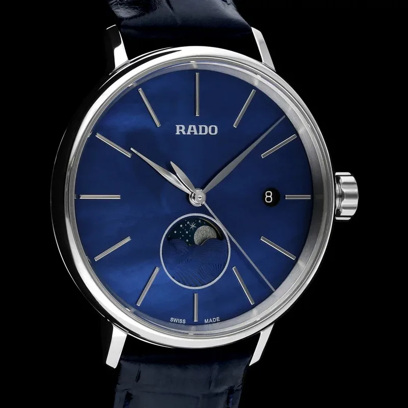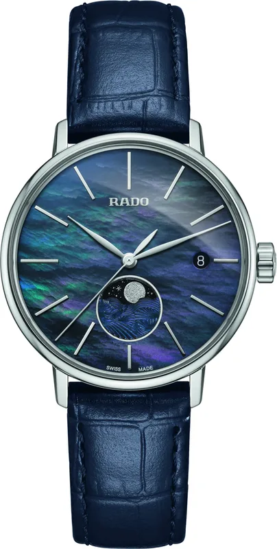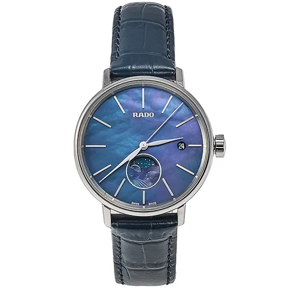 R-38834191 שעון ראדו מיוחד יבואן רשמי | דגם לנשים ברצועת עור כחולה | לוח כחול עם תצוגת ירח | סוגר פטנט | 5 שנים אחריות | מלאי מוגבל | R22883915 | Rado Coupole Classic Moonphase