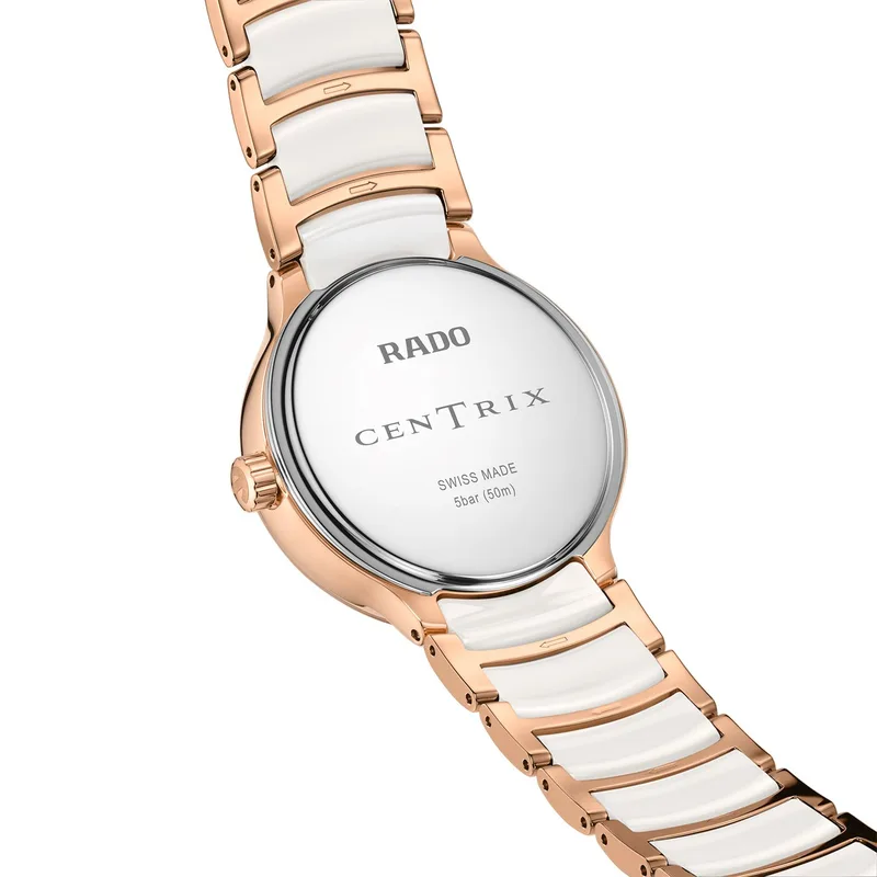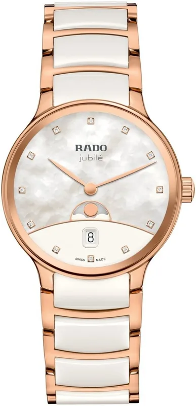 R-62323092 | R30232922 שעון ראדו יבואן רשמי לאישה | דגם חדש 2026 עם תצוגת ירח | דגם קרמי לבן בשילוב זהב רוז | לוח פנינה משובץ 12 יהלומים | 5 שנות אחריות | R30232922 | Rado Centrix M Moonphase Jubilé