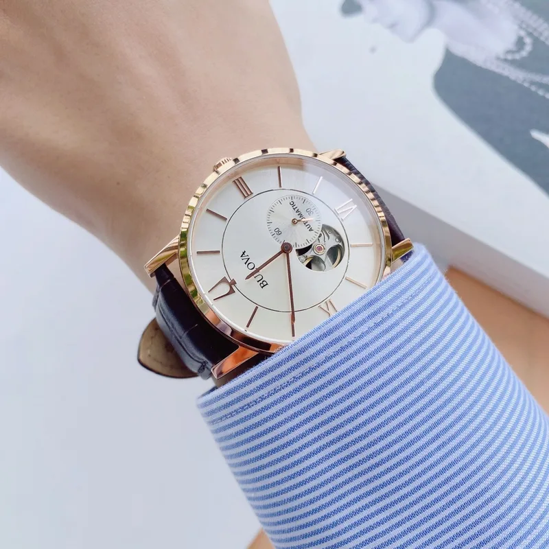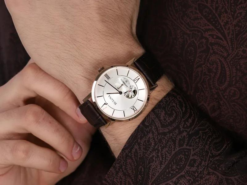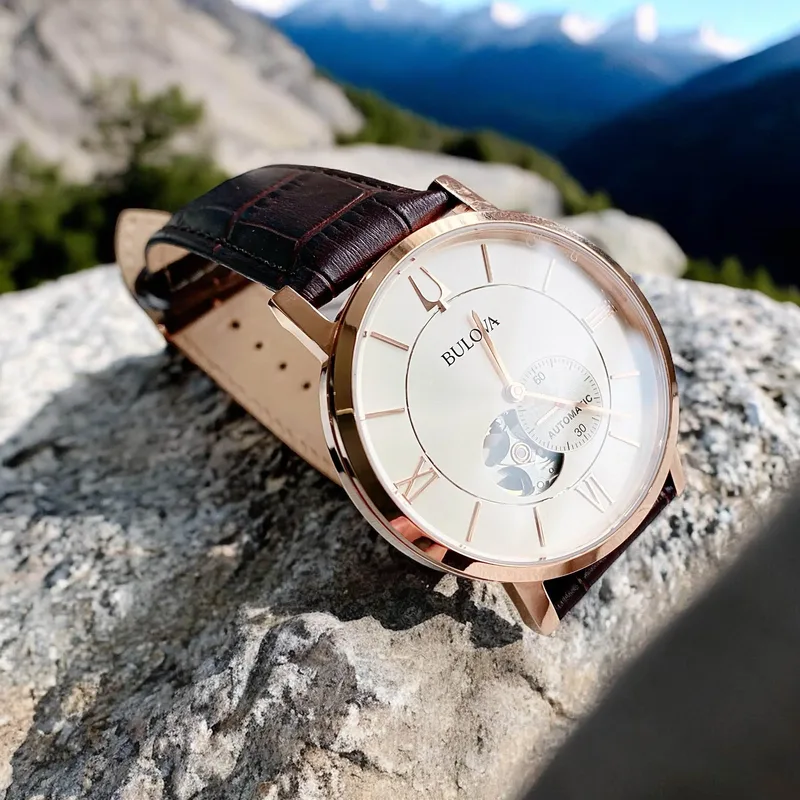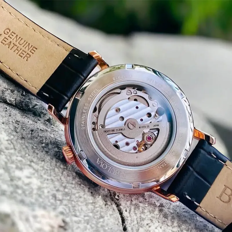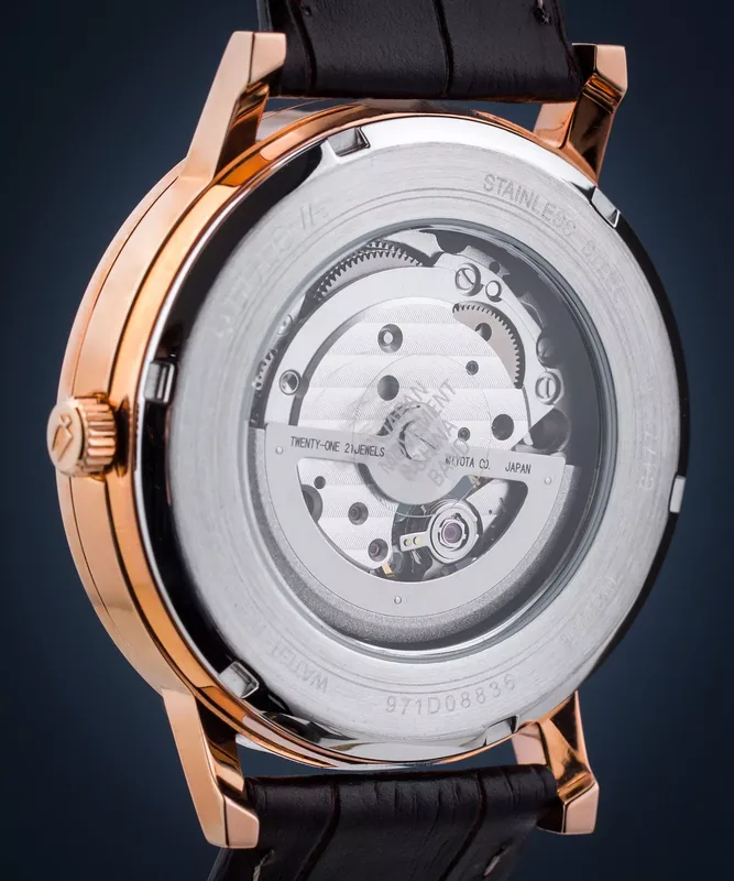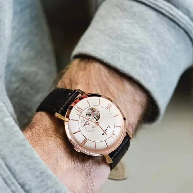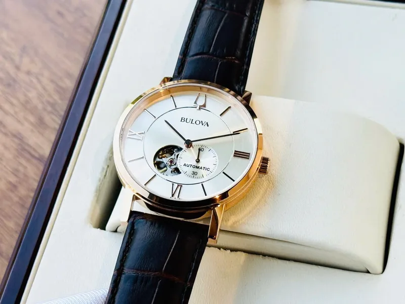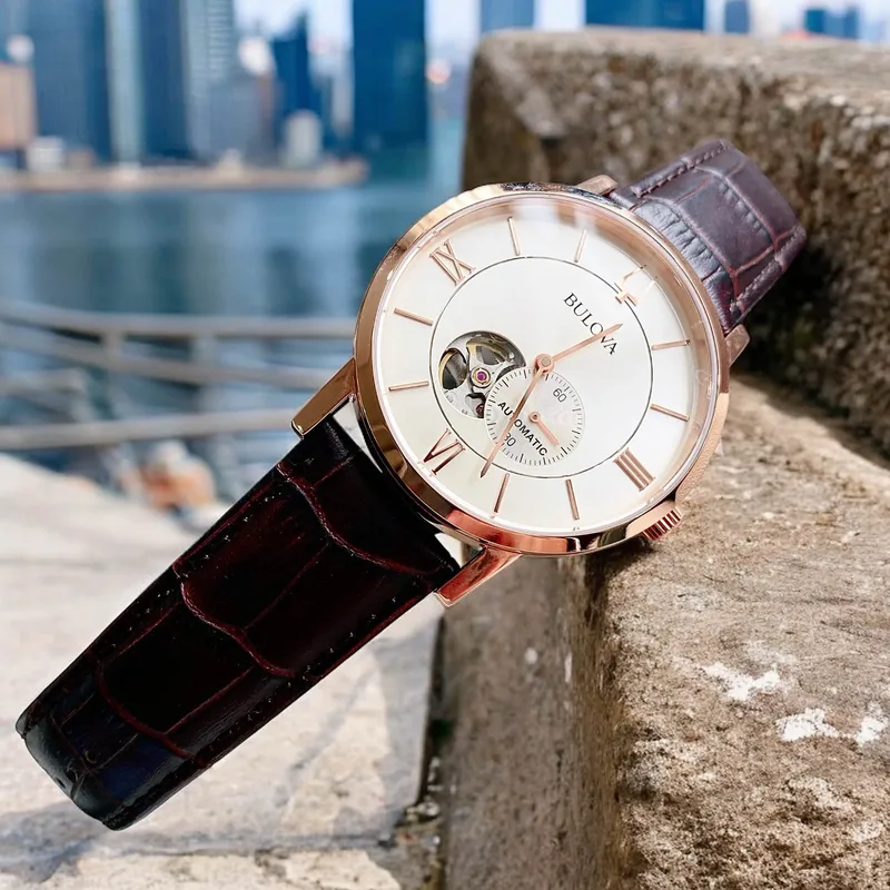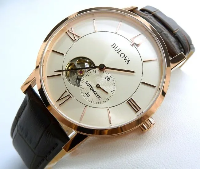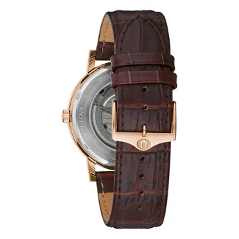 97A150 שעון בולובה אוטומטי לגברים | לוח לב פתוח רומי | רצועת עור חומה | רוז גולד עם חלון אחורי שקוף| 97A150 Bulova Clipper Automatic Open Heart Men's Watch
