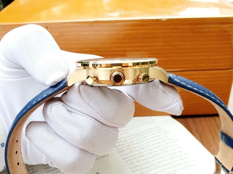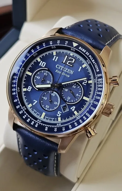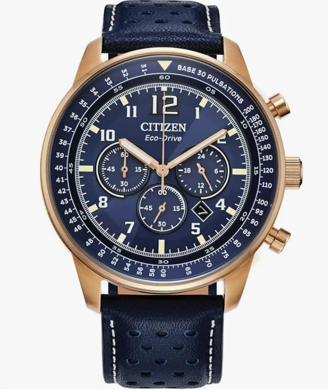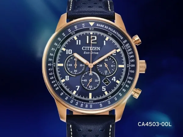 CA4503-00L שעון יד סיטיזן רוז גולד לגברים | דגם ספורטיבי אלגנטי בלוח כחול זרחני | רצועה כחולה | דגם כרונוגרף אקו דרייב סולארי | Eco-Drive Chronograph Blue Dial Men's Watch CA4503-00L by Citizen
