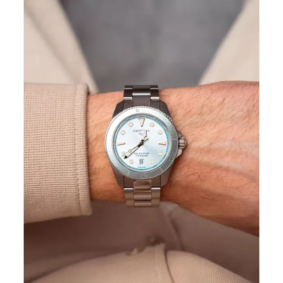 C048.410.44.351.00 שעון טיטניום חדש לגברים מסדרת אקשן 300 מטר | לוח טיפני תכלת מיוחד |וזרחני | שעון קל משקל כולל 5 שנים אחריות יבואן רשמי | Certina DS Action Titanium Quartz Light Blue C0484104435100