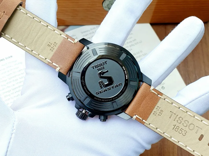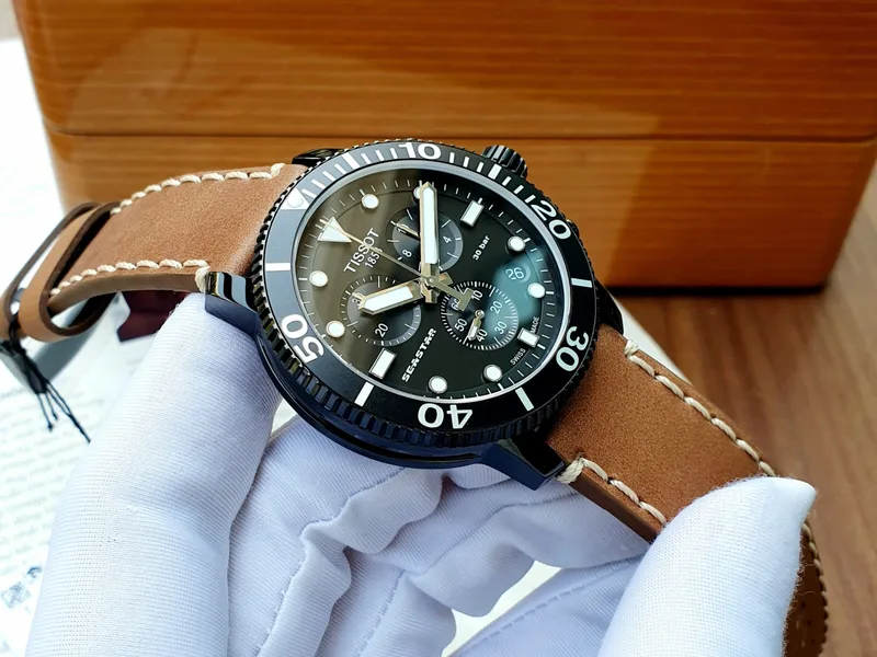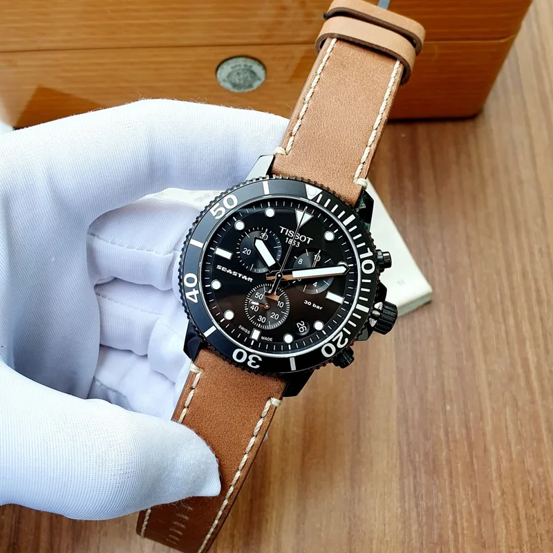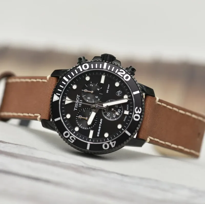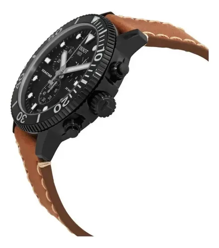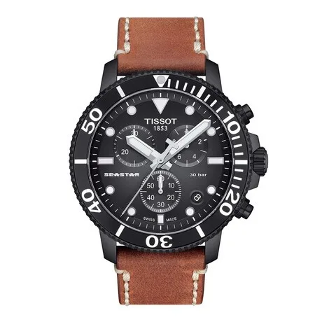 T120.417.36.051.00 שעון אלגנטי ספורטיבי של טיסו מסדרת סי סטאר | דגם שחור כרונוגרף ברצועת עור חומה |שנתיים אחריות | Tissot Mens Seastar 1000 Chronograph 316L Stainless Steel case with PVD T120417360510