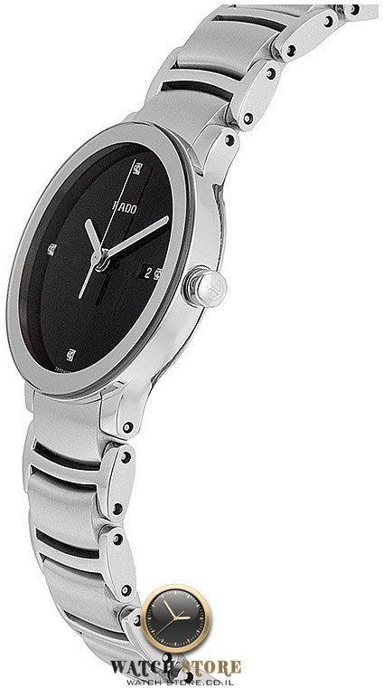 R-09283071 שעון ראדו יבואן רשמי מסדרת סנטריקס לאישה | שעון כסוף בלוח שחור משובץ 4 יהלומים | 5 שנות אחריות| מנגנון שווצרי | R30928713 Rado Centrix Jubile Mini Steel Quartz Ladies | שעוני יוקרה לנשים