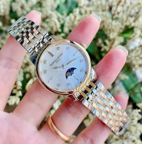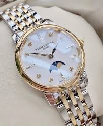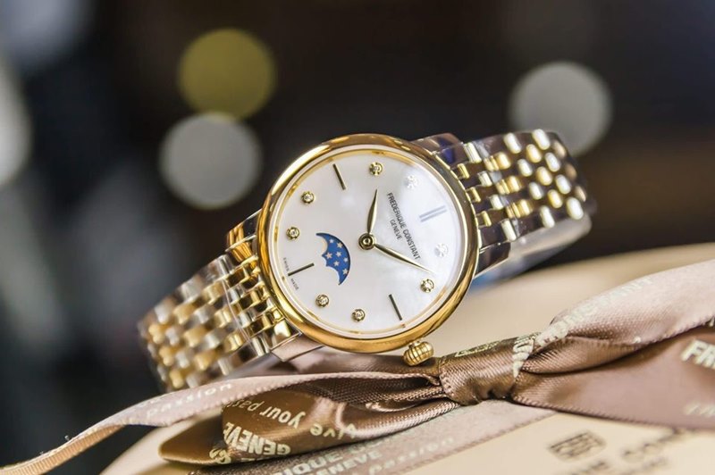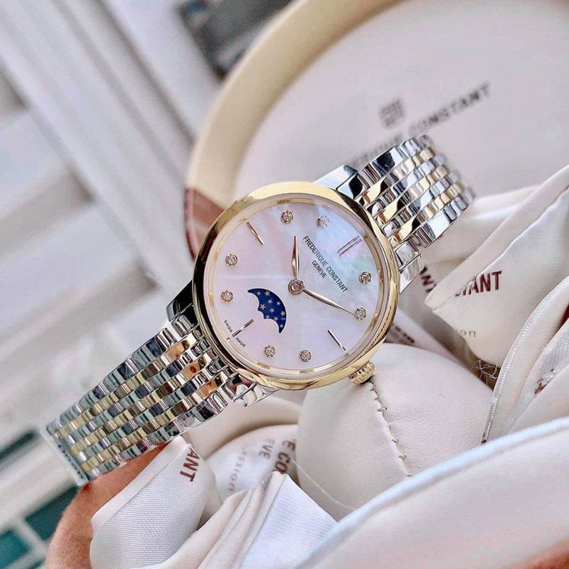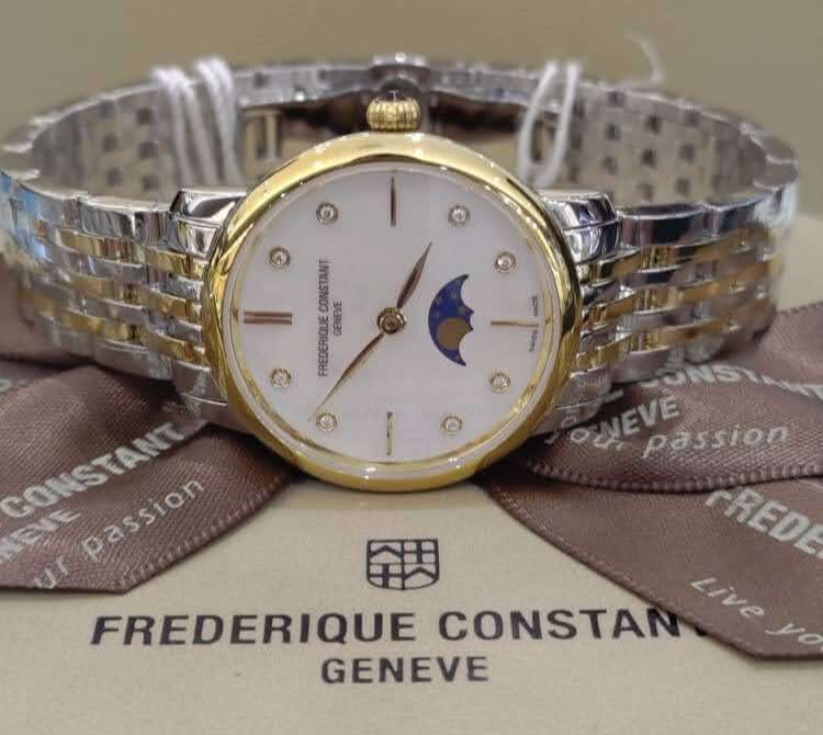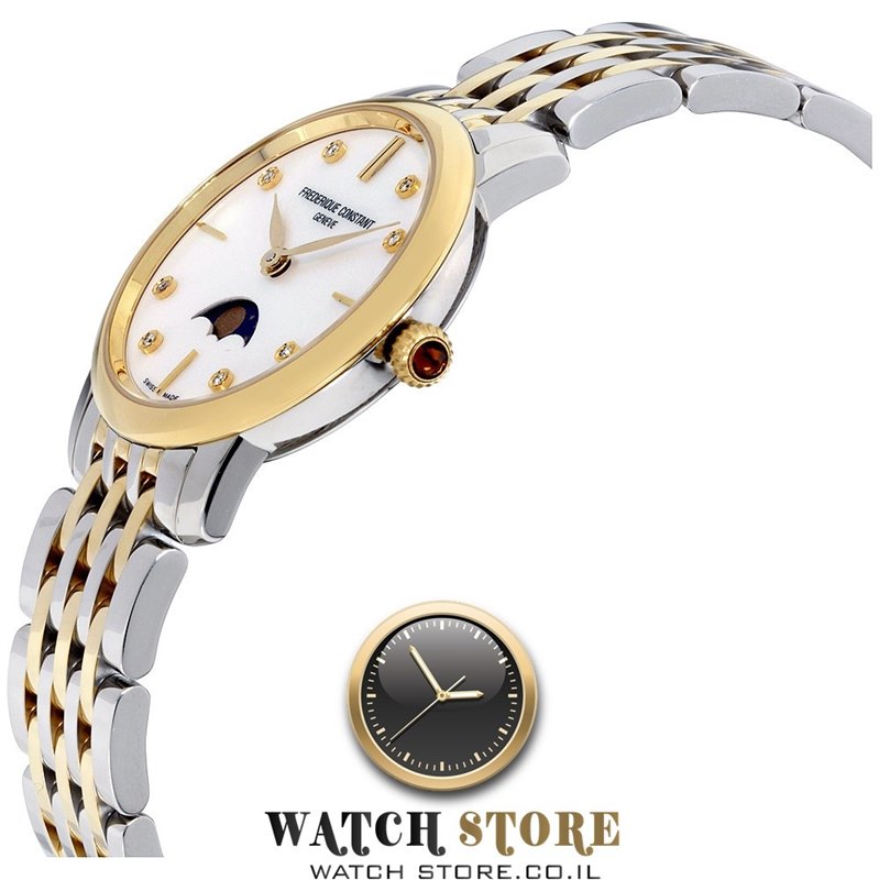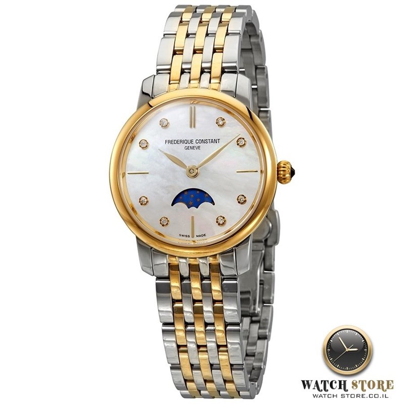FC-206MPWD1S3B שעון יד פרדריק קונסטנט לנשים ברצועת טוטון ולוח לבן פנינה| תצוגת מון פייס משובץ יהלומים | שנתיים אחריות | חנות שעונים בראשון לציון | Frederique Constant Slimline Mother of Pearl Diamond
