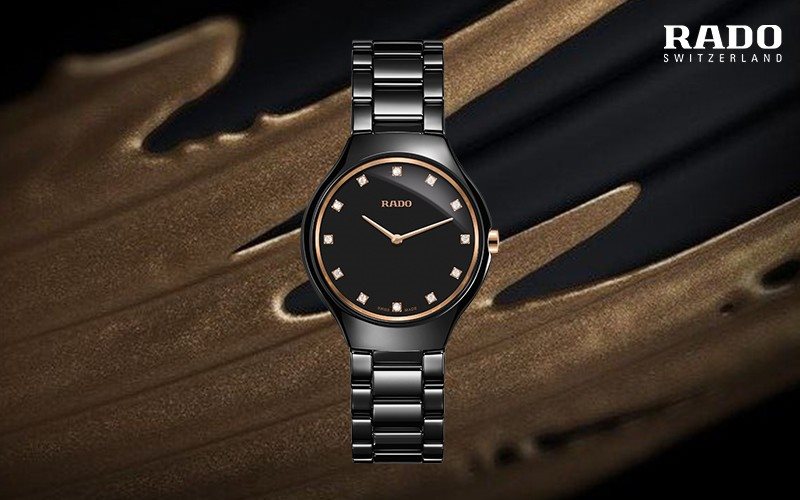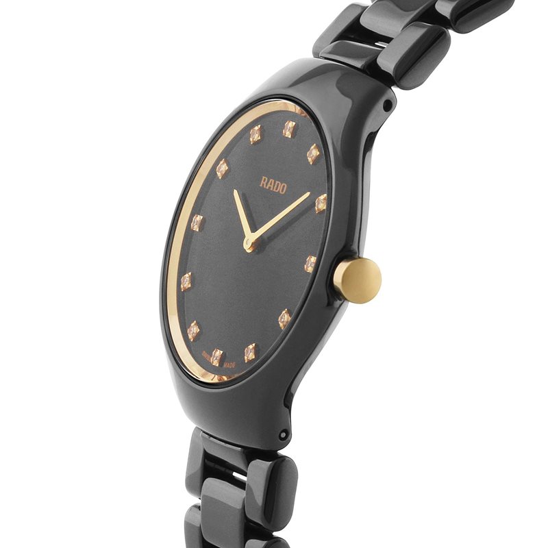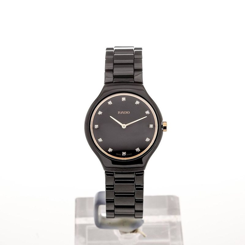 R27742722 שעון ראדו מדרת טרו לנשים | דגם קרמיקה משובץ 12 יהלומים | שעון דק וקל משקל | מלאי מוגבל כולל שנתיים אחריות | Rado 30mm Black Ceramic Band Case Quartz Analog Watch R27742722
