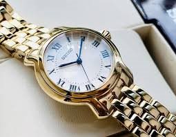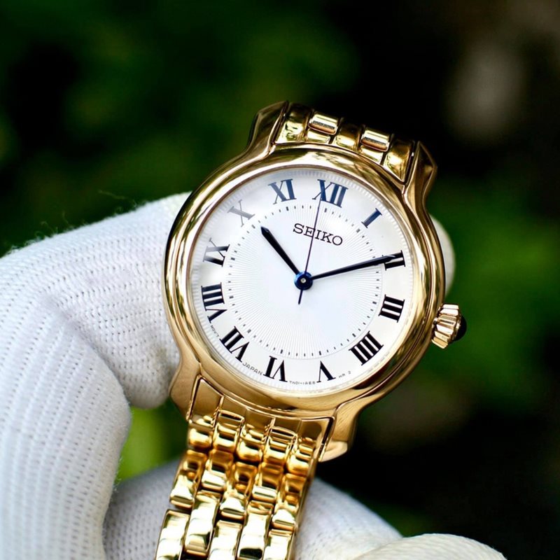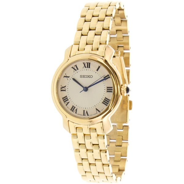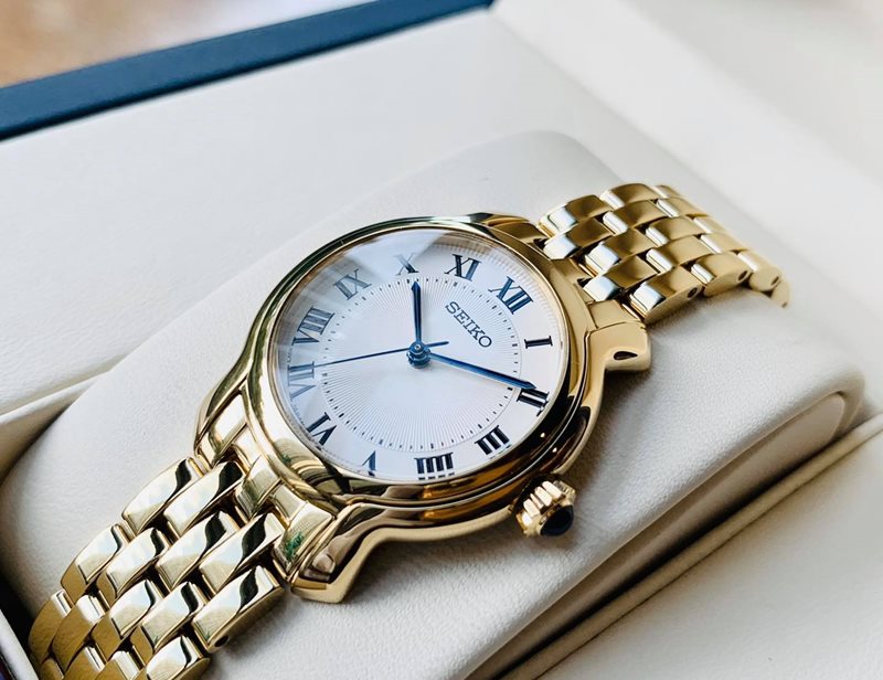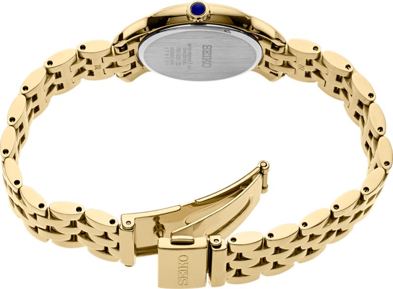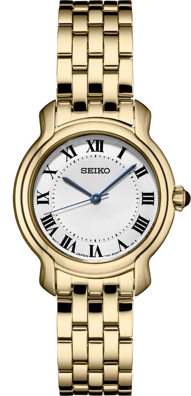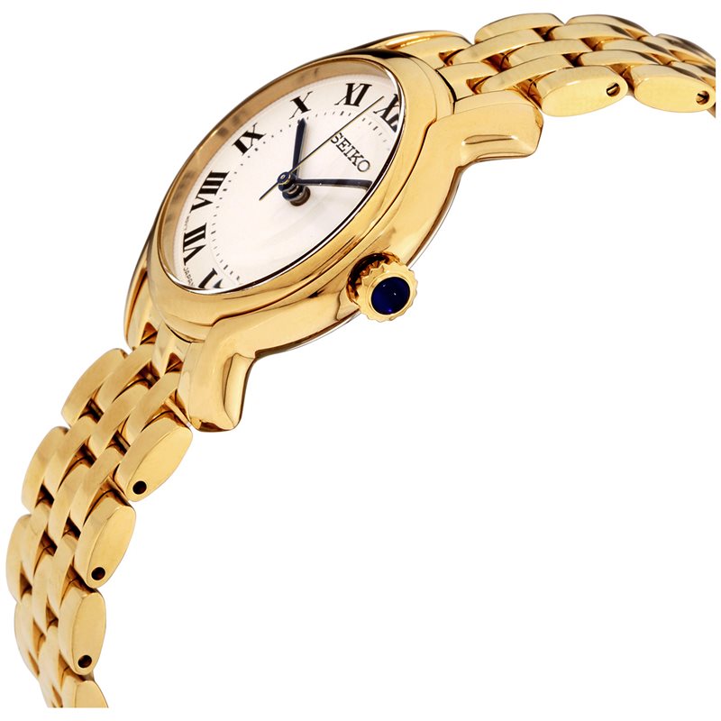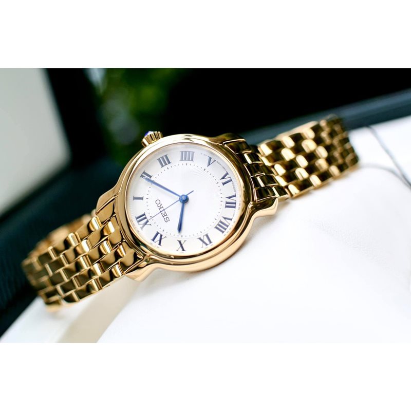 SRZ520 סייקו זהב לנשים | לוח לבן רומיות | מחוגים ואבן ספיר כחולה למראה מושלם ויוקרתי | שנתיים אחריות | Seiko Women's Essential Stainless Steel Watch - SRZ520