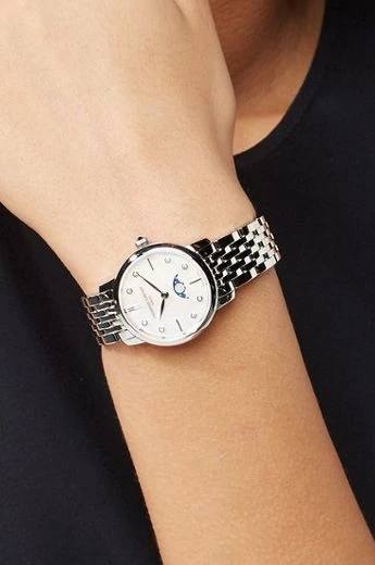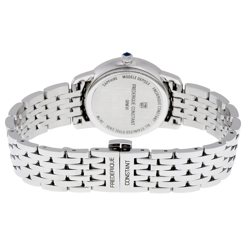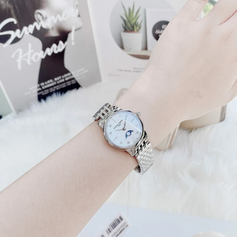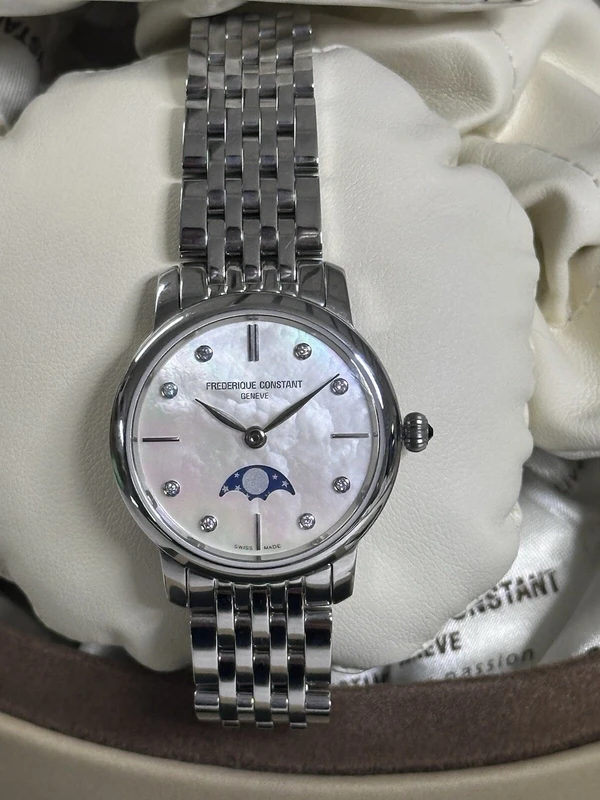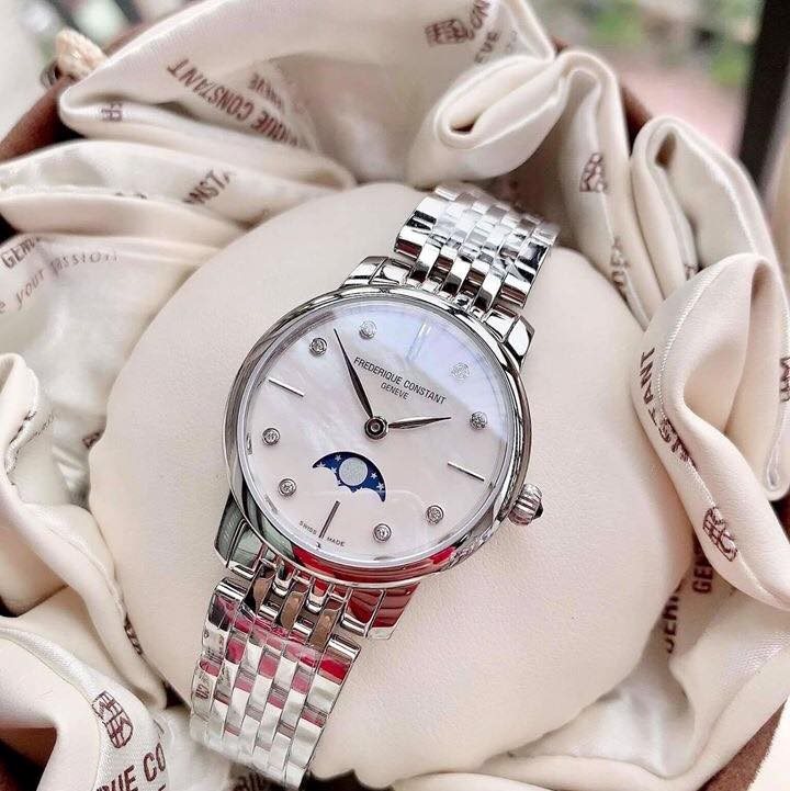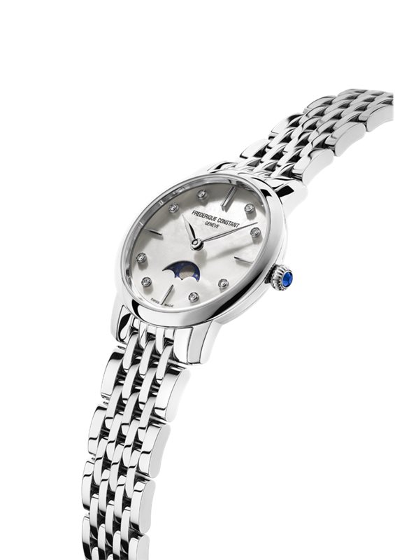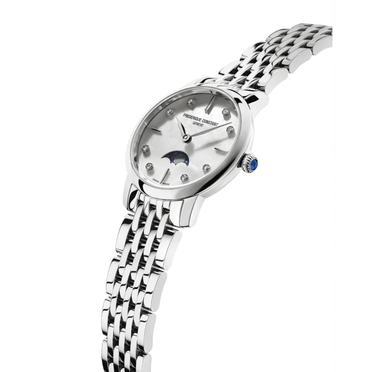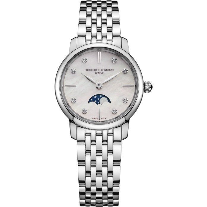FC-206MPWD1S6B שעון יוקרתי לאישה של פרדריק קונסטנט שוויץ | לוח לבן פנינה עם תצוגת ירח משובץ 8 יהלומים | שנתיים אחריות | Frederique Constant Slimline Ladies Moonphase – FC-206MPWD1S6B
