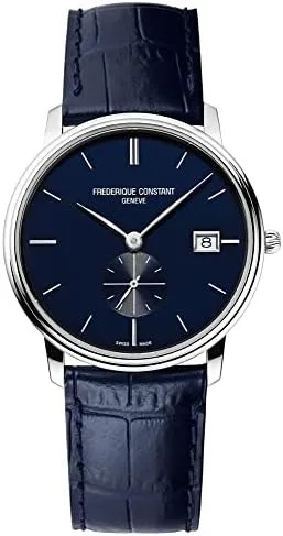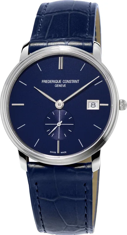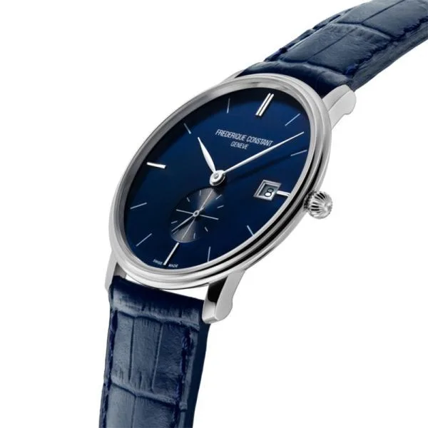 FC-245N4S6 שעון יוקרתי אופנתי מיוחד של פרדריק קונסטנט שוויץ | שעון ברצועת קרוק כחולה ולוח כחול עם שעון שניות | רק 5 מ''מ עובי השעון | Frederique Constant Slimline Small Seconds FC-245N4S6