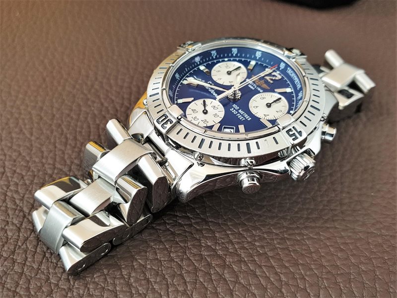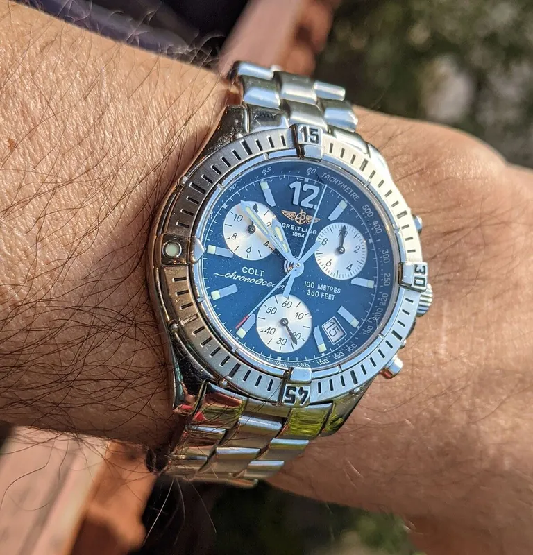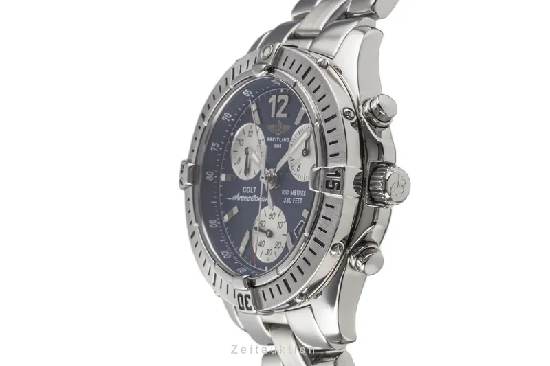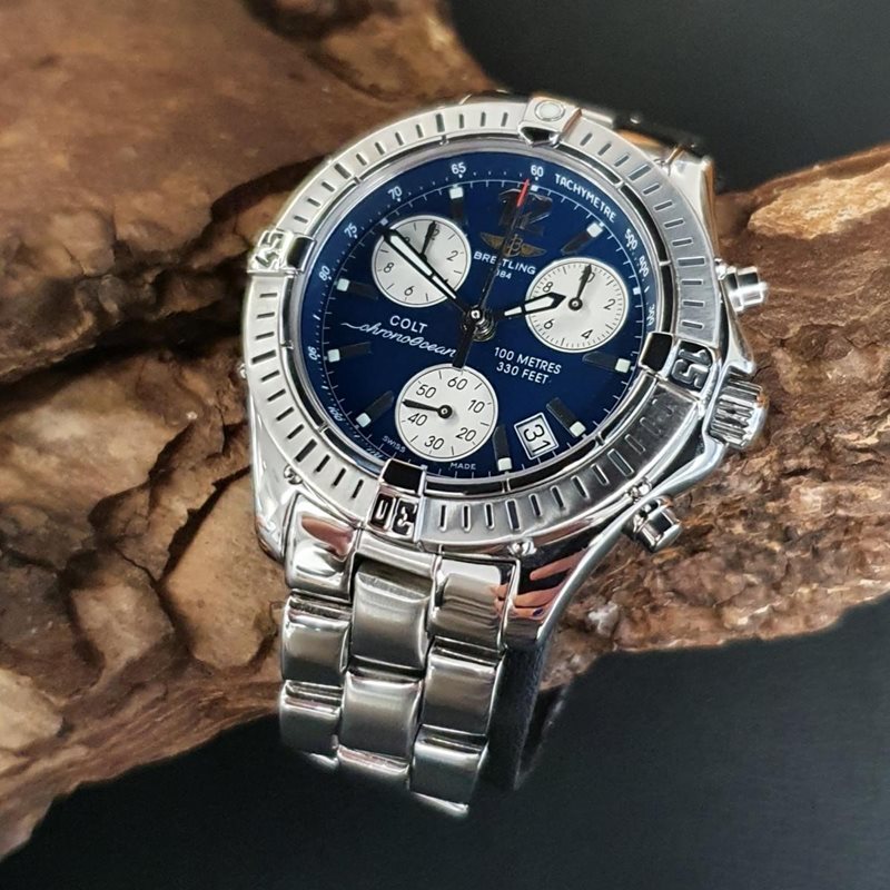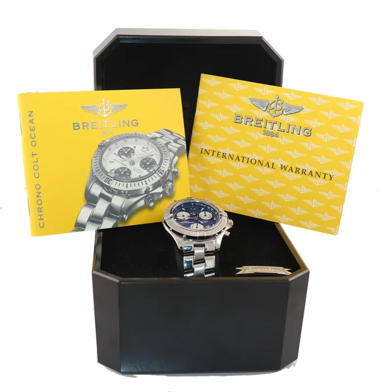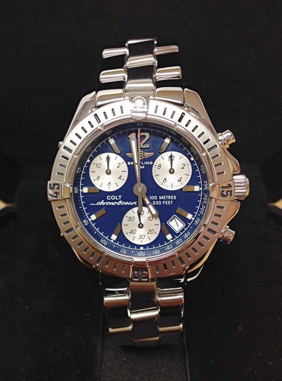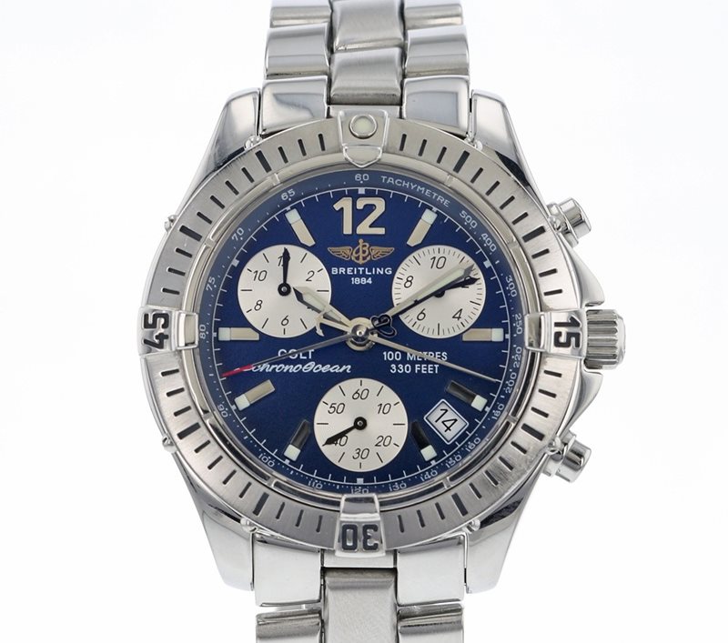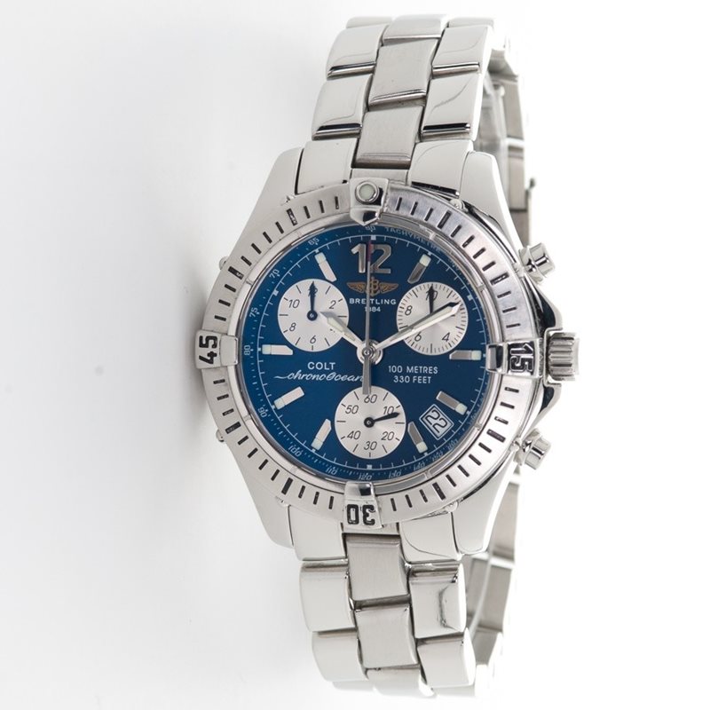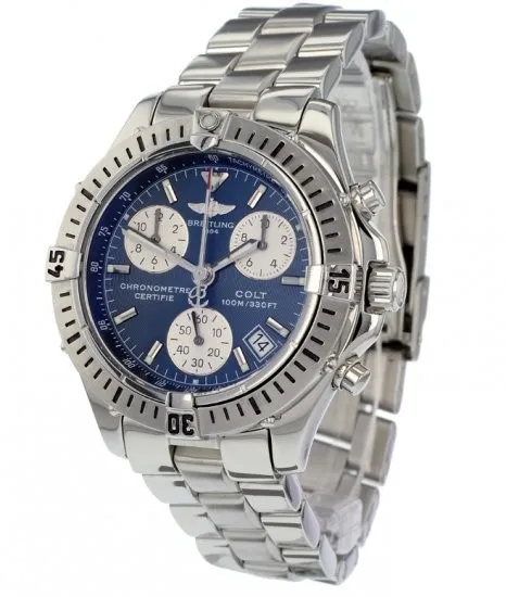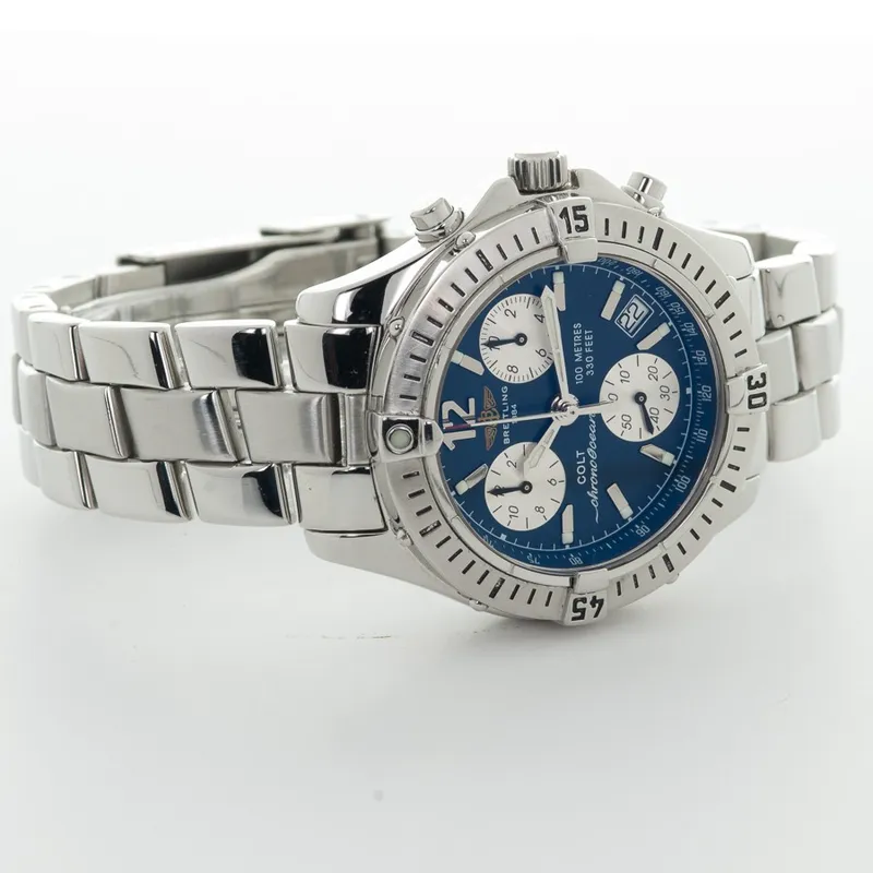 A53350 שעון יד ברייטלינג קולד יד 2 כולל תעודות קוטר 38 מ''מ | דגם כרונוגרף | לוח כחול לבן כולל אחריות | חנות שעוני יוקרה יד שנייה | BREITLING CHRONOMETRE COLT QUARTZ STAINLESS STEEL A53350 WATCH