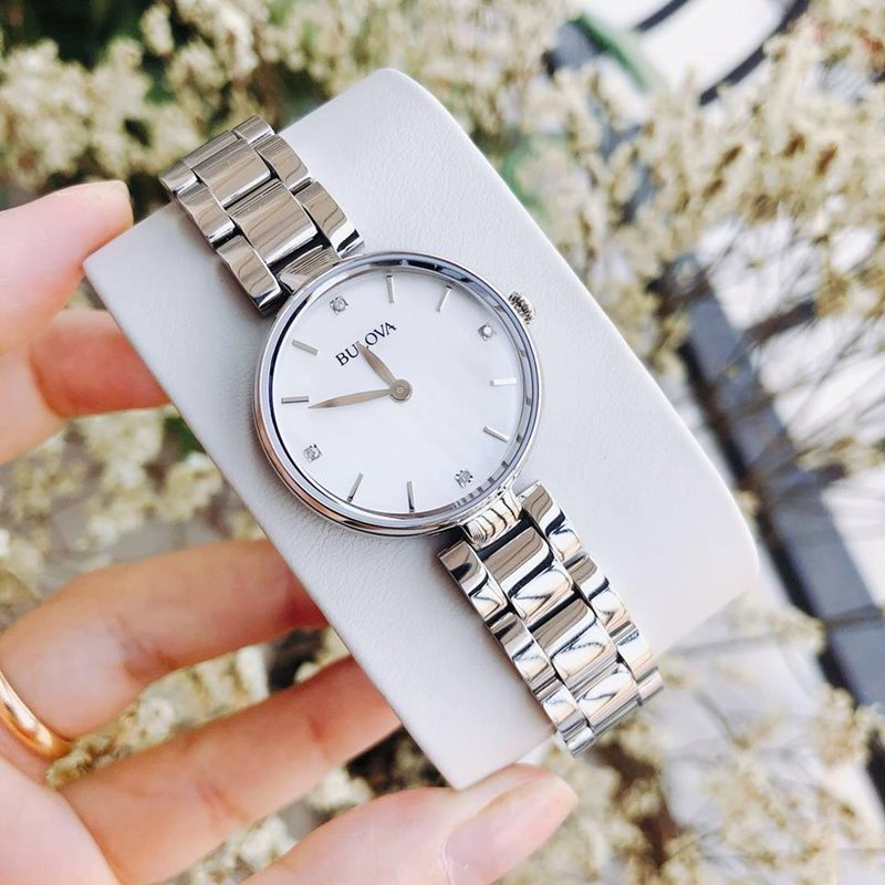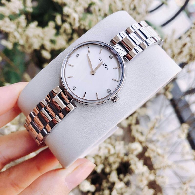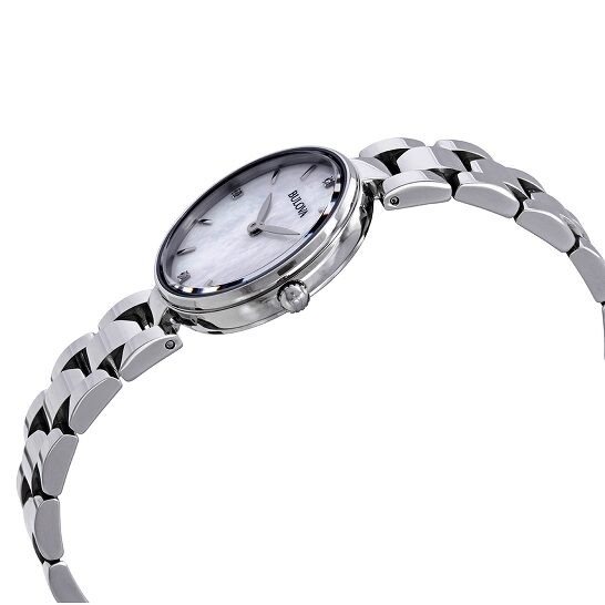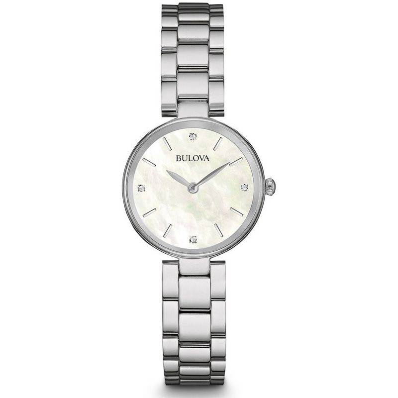 96P159 שעון בולובה לאישה בלוח פנינה משובץ 4 יהלומים | דגם עדין כולל שנתיים אחריות | שעוני אופנה מיוחדים לנשים | Bulova Diamond Mother of Pearl Dial Ladies Watch