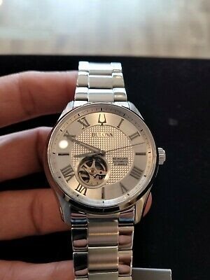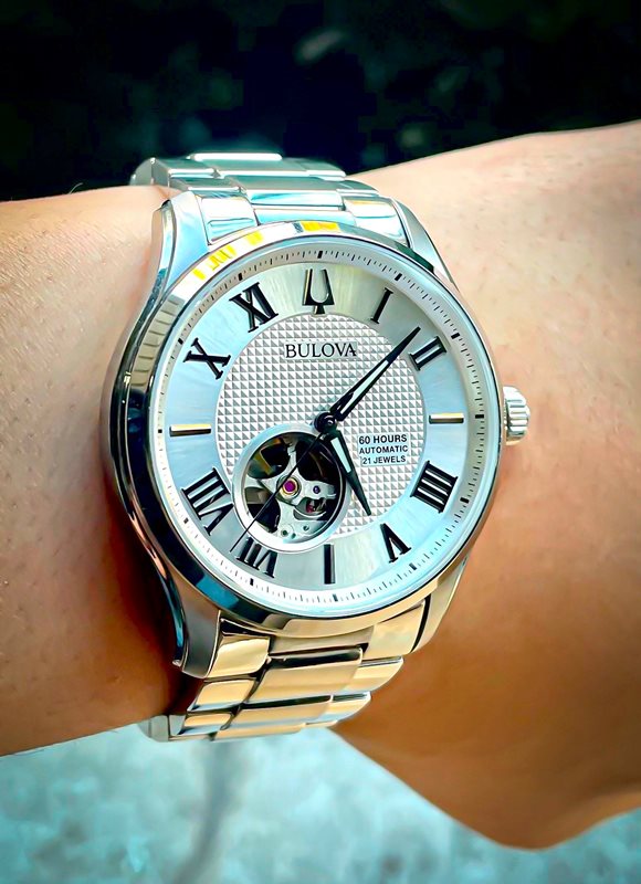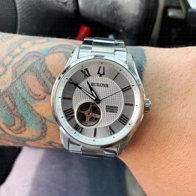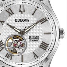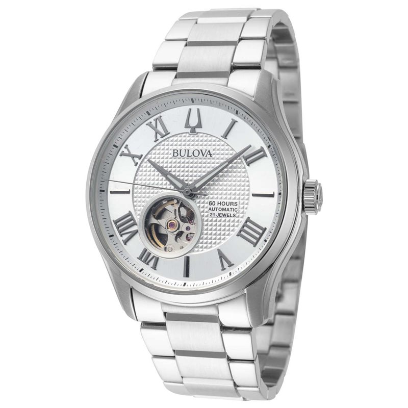 96A207 שעון יד בולובה לגברים דגם אוטומטי עם 60 שעות טעינה לוח סקלטון וספרות רומיות | שנתיים אחריות | Wilton Automatic Silver Dial Men's Watch 96A207 by Bulova