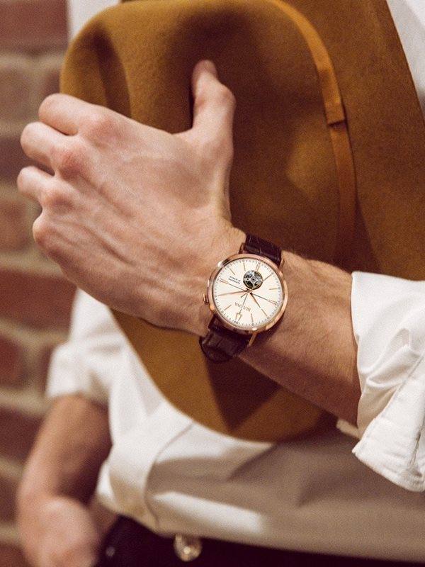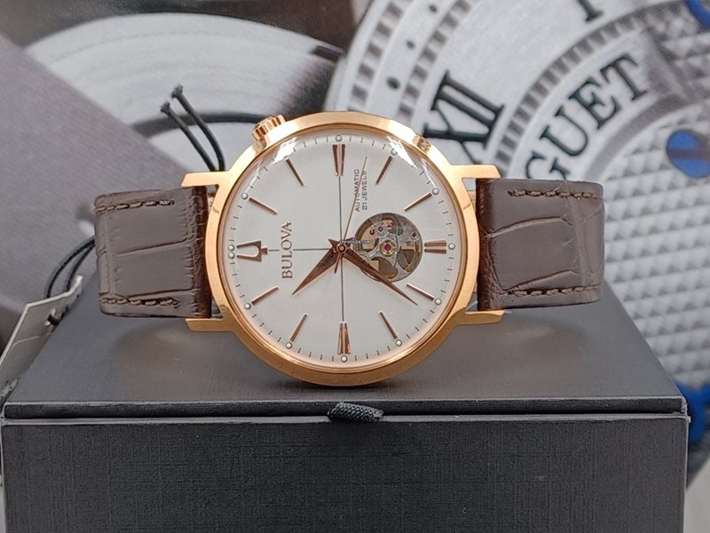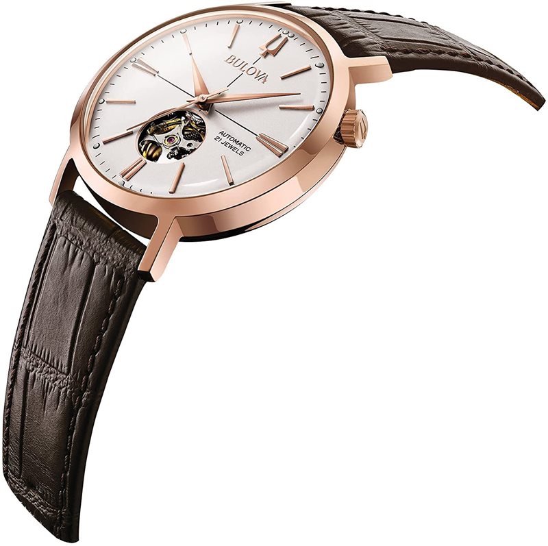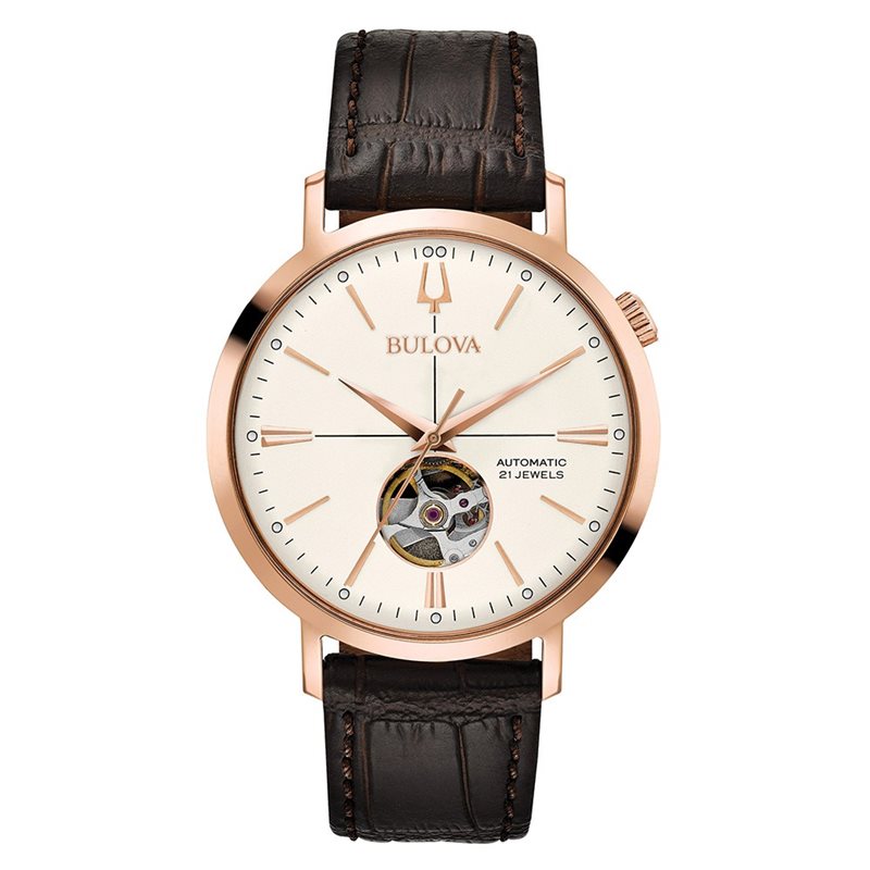 97A136 שעון בולובה לגברים אלגנטי | רוז גולד ברצועת עור חומה לוח בהיר פתוח | שנתיים אחריות | מלאי מוגבל | Bulova Aerojet White Men's Watch - 97A136