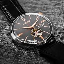 98A187 שעון יד בולובה אוטומטי לגברים | לוח אפור פתוח ברצועת עור אלגנטית | שעוני אופנה יוקרתיים לגברים | Classic Automatic Grey Dial Black Leather Men's Watch 98A187 by Bulova