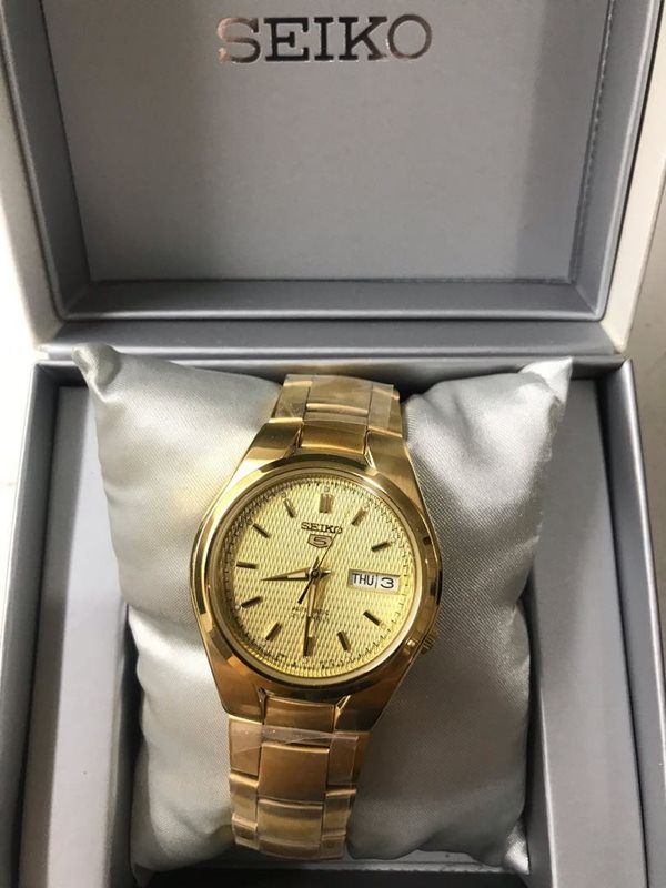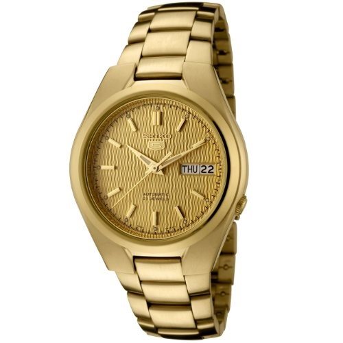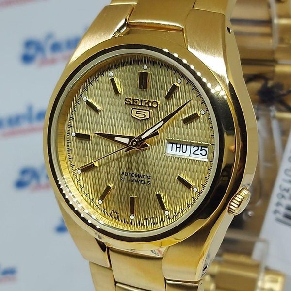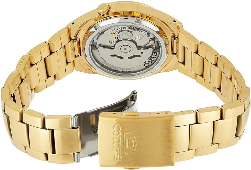 SNK610 שעון סייקו אוטומטי קלאסי לגברים מסדרת סייקו 5 | לוח זהב מיוחד תאריכון כפול וחלון אחורי שקוף | Seiko Men's SNK610 Seiko 5 Automatic Gold Tone