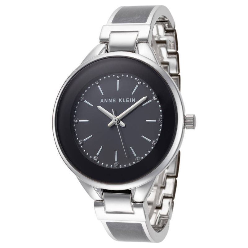 AK-3319GYSV שעון יד צמיד של אן קליין רצועה כסופה ואפורה ממותגת | לוח אפור משובץ זרקונים | שעוני צמידים של אן קליין במבצע | Quartz Crystal Grey Dial Ladies Watch AK/3319GYSV by Anne Klein