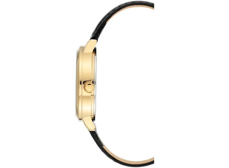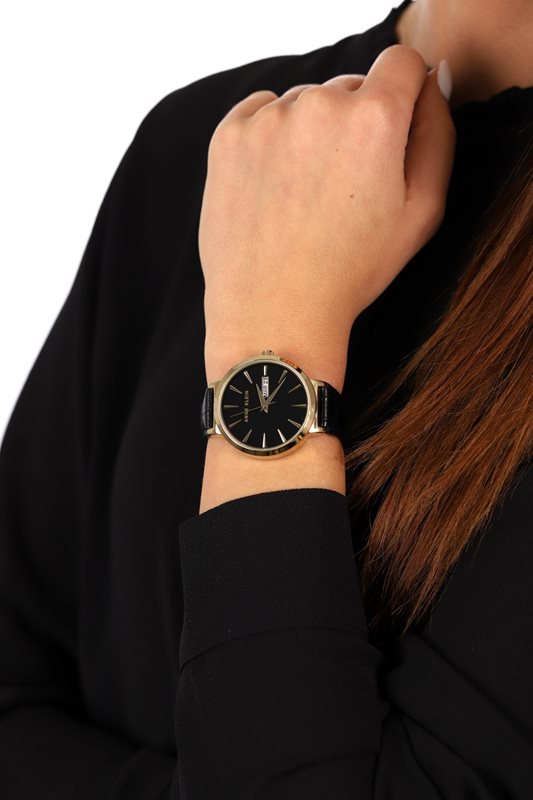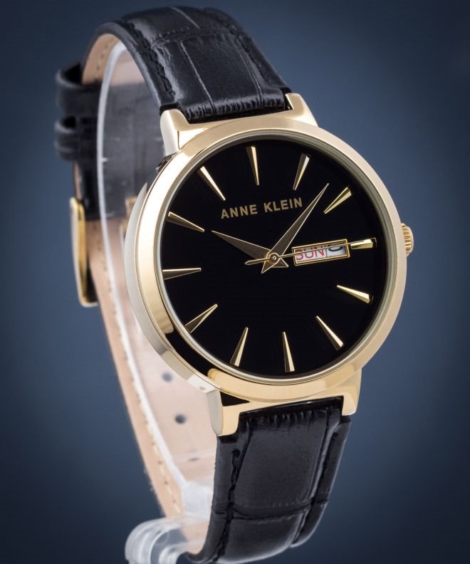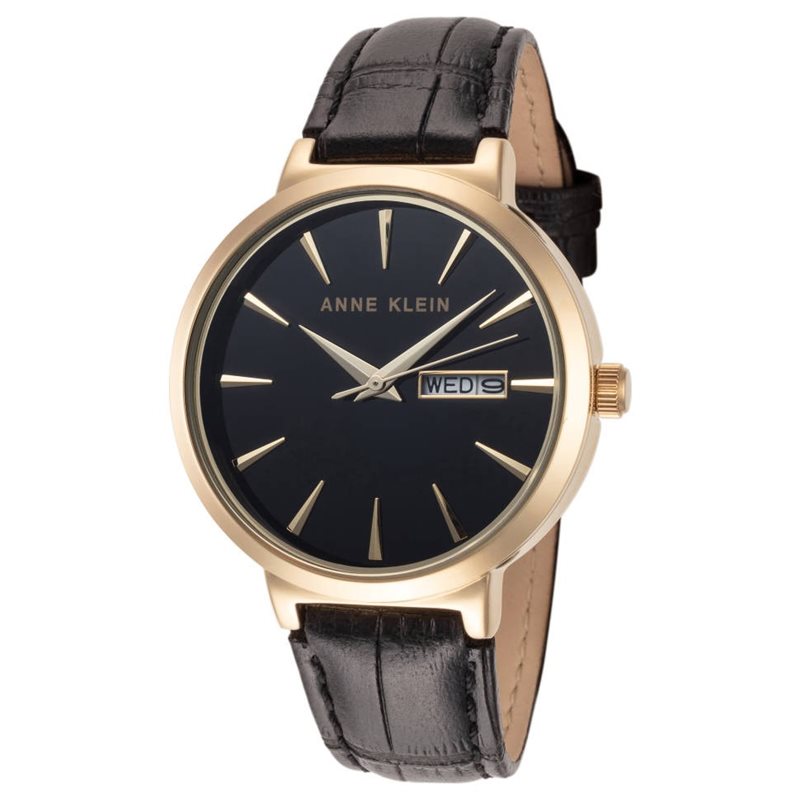 AK-3824BKBK שעון אן קליין אלגנטי לנשים | שעון בשילוב זהב ורצועת עור שחורה | תאריכון כפול | מלאי מוגבל | שנתיים אחריות | Anne Klein Quartz Glossy Black Dial Ladies Watch AK-3824BKBK